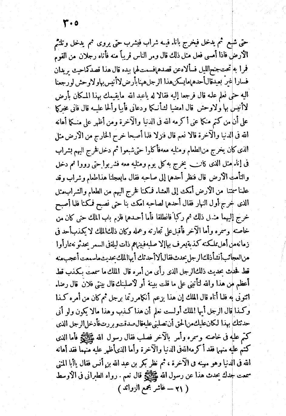 قَالَ: " فَنَزَلَا، فَلَمَّا أَصْبَحَا خَرَّجَ الْخَارِجُ مِنَ الْأَرْضِ مِثْلَ الَّذِي كَانَ يُخْرِجُ مِنَ الطَّعَامِ وَمِثْلَيْهِ مَعَهُ، فَأَكَلُوا حَتَّى شَبِعُوا، ثُمَّ دَخَلَ فَخَرَجَ إِلَيْهِمْ بِشَرَابٍ فِي إِنَاءٍ مِثْلِ الَّذِي كَانَ يَخْرُجُ بِهِ كُلَّ يَوْمِ وَمِثْلَيْهِ مَعَهُ، فَشَرِبُوا حَتَّى رَوُوا، ثُمَّ دَخَلَ، وَالْتَأَمَتِ الْأَرْضُ ". قَالَ: " فَنَظَرَ أَحَدُهُمَا إِلَى صَاحِبِهِ، فَقَالَ: مَا يُعْجِلُنَا؟ هَذَا طَعَامٌ، وَشَرَابٌ وَقَدْ عَلِمْنَا سَمْتَنَا مِنَ الْأَرْضِ، امْكُثْ إِلَى الْعَشَاءِ. فَمَكَثَا، فَخَرَجَ إِلَيْهِمْ مِنَ الطَّعَامِ وَالشَّرَابِ مِثْلُ الَّذِي خَرَجَ أَوَّلَ النَّهَارِ، فَقَالَ أَحَدُهُمَا لِصَاحِبِهِ: امْكُثْ بِنَا حَتَّى نُصْبِحَ، فَمَكَثَا. فَلَمَّا أَصْبَحَا خَرَجَ إِلَيْهِمَا مِثْلُ ذَلِكَ. ثُمَّ رَكِبَا فَانْطَلَقَا، فَأَمَّا أَحَدُهُمَا فَلَزِمَ بَابَ الْمَلِكِ حَتَّى كَانَ مِنْ خَاصَّتِهِ وَسُمَّرِهِ، وَأَمَّا الْآخَرُ فَأَقْبَلَ عَلَى تِجَارَتِهِ وَعَمَلِهِ، وَكَانَ ذَلِكَ الْمَلِكُ لَا يَكْذِبُ أَحَدٌ فِي زَمَانِهِ مِنْ أَهْلِ مَمْلَكَتِهِ كَذْبَةً يُعْرَفُ بِهَا إِلَّا صَلَبَهُ، فَبَيْنَمَا هُمْ ذَاتَ لَيْلَةٍ فِي السَّمَرِ يُحَدِّثُونَهُ مِمَّا رَأَوْا مِنَ الْعَجَائِبِ أَنْشَأَ ذَلِكَ الرَّجُلُ يُحَدِّثُ فَقَالَ: أَلَا أُحَدِّثُكَ أَيُّهَا الْمَلِكُ بِحَدِيثٍ مَا سَمِعْتَ أَعْجَبَ مِنْهُ قَطُّ؟ فَحَدَّثَ بِحَدِيثِ ذَلِكَ الرَّجُلِ الَّذِي رَأَى مِنْ أَمْرِهِ، قَالَ الْمَلِكُ: مَا سَمِعْتُ بِكَذِبٍ قَطُّ أَعْظَمَ مِنْ هَذَا، وَاللَّهِ، لَتَأْتِيَنِّي عَلَى مَا قُلْتَ بِبَيِّنَةٍ أَوْ لَأَصْلُبَنَّكَ، قَالَ: بَيِّنَتِي فُلَانٌ، قَالَ: رِضَاءٌ. ائْتُونِي بِهِ، فَلَمَّا أَتَاهُ قَالَ الْمَلِكُ: إِنَّ هَذَا يَزْعُمُ أَنَّكُمَا مَرَرْتُمَا بِرَجُلٍ، ثُمَّ كَانَ مِنْ أَمْرِهِ كَذَا وَكَذَا، قَالَ الرَّجُلُ: أَيُّهَا الْمَلِكُ، أَوَ لَسْتَ تَعْلَمُ أَنَّ هَذَا كَذِبٌ، وَهَذَا مَا لَا يَكُونُ؟ وَلَوْ أَنِّي حَدَّثْتُكَ بِهَذَا لَكَانَ عَلَيْكَ مِنَ الْحَقِّ أَنْ تَصْلُبَنِي عَلَيْهِ. قَالَ: صَدَقْتَ وَبَرَرْتَ، فَأَدْخَلَ الرَّجُلَ الَّذِي كَتَمَ عَلَيْهِ فِي خَاصَّتِهِ وَسُمَّرِهِ، وَأَمَرَ بِالْآخَرِ فَصُلِبَ ".