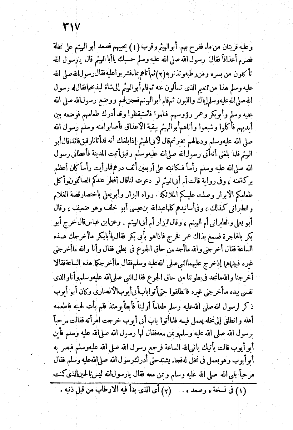 وَعَلَيْهِ قِرْبَتَانِ مِنْ مَاءٍ، فَفَرِحَ بِهِمْ أَبُو الْهَيْثَمِ، وَقَرُبَ يُحَيِّيهِمْ، فَصَعِدَ أَبُو الْهَيْثَمِ عَلَى نَخْلَةٍ فَصَرَمَ أَغْدَاقًا، فَقَالَ رَسُولُ اللَّهِ - صَلَّى اللَّهُ عَلَيْهِ وَسَلَّمَ -: " حَسْبُكَ يَا أَبَا الْهَيْثَمِ ". قَالَ: يَا رَسُولَ اللَّهِ، تَأْكُلُونَ مِنْ بُسْرِهِ، وَمِنْ رُطَبِهِ، وَتَذْنُوبِهِ، ثُمَّ أَتَاهُمْ بِمَاءٍ فَشَرِبُوا عَلَيْهِ. فَقَالَ رَسُولُ اللَّهِ - صَلَّى اللَّهُ عَلَيْهِ وَسَلَّمَ -: " هَذَا مِنَ النَّعِيمِ الَّذِي تُسْأَلُونَ عَنْهُ ". ثُمَّ قَامَ أَبُو الْهَيْثَمِ إِلَى شَاةٍ لِيَذْبَحَهَا، فَقَالَ لَهُ رَسُولُ اللَّهِ - صَلَّى اللَّهُ عَلَيْهِ وَسَلَّمَ -: " إِيَّاكَ وَاللَّبُونَ ". ثُمَّ قَامَ أَبُو الْهَيْثَمِ فَعَجَنَ لَهُمْ. وَوَضَعَ رَسُولُ اللَّهِ - صَلَّى اللَّهُ عَلَيْهِ وَسَلَّمَ - وَأَبُو بَكْرٍ، وَعُمَرُ رُءُوسَهُمْ فَنَامُوا، فَاسْتَيْقَظُوا وَقَدْ أَدْرَكَ طَعَامُهُمْ، فَوَضَعَهُ بَيْنَ أَيْدِيهِمْ ; فَأَكَلُوا وَشَبِعُوا. وَأَتَاهُمْ أَبُو الْهَيْثَمِ بِبَقِيَّةِ الْأَعْذَاقِ، فَأَصَابُوا مِنْهُ، وَسَلَّمَ رَسُولُ اللَّهِ - صَلَّى اللَّهُ عَلَيْهِ وَسَلَّمَ - وَدَعَا لَهُمْ بِخَيْرٍ، ثُمَّ قَالَ لِأَبِي الْهَيْثَمِ: " إِذَا بَلَغَكَ أَنَّهُ قَدْ أَتَانَا رَقِيقٌ فَائْتِنَا ".