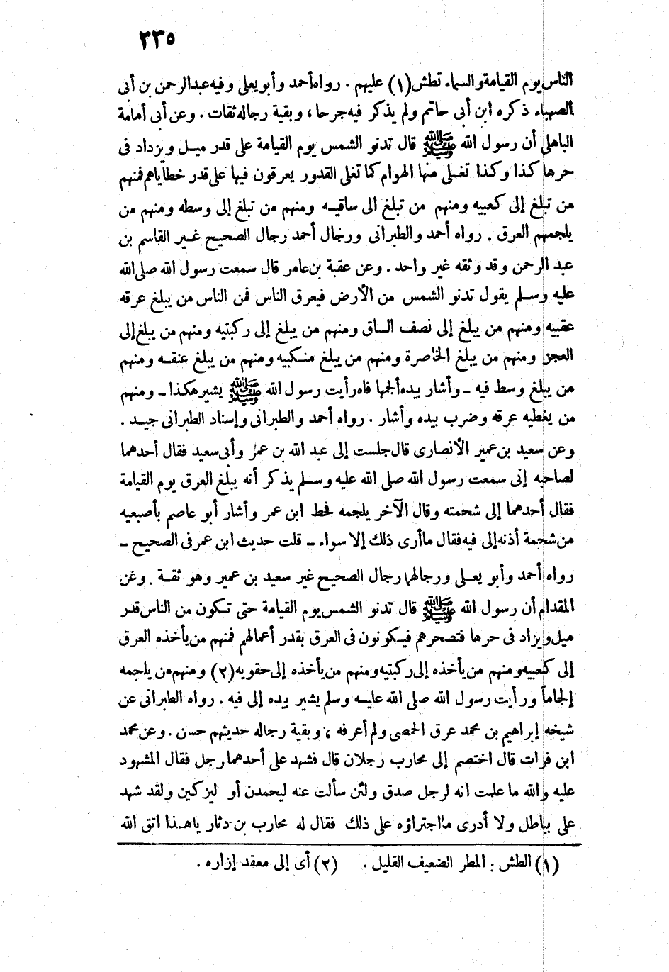 18335 - وَعَنْ عُقْبَةَ بْنِ عَامِرٍ قَالَ: سَمِعْتُ رَسُولَ اللَّهِ - صَلَّى اللَّهُ عَلَيْهِ وَسَلَّمَ - يَقُولُ: «تَدْنُو الشَّمْسُ مِنَ الْأَرْضِ فَيَعْرَقُ النَّاسُ، فَمِنَ النَّاسِ مَنْ يَبْلُغُ عَرَقُهُ عَقِبَيْهِ، وَمِنْهُمْ مَنْ يَبْلُغُ إِلَى نِصْفِ السَّاقِ، وَمِنْهُمْ مَنْ يَبْلُغُ إِلَى رُكْبَتَيْهِ، وَمِنْهُمْ مَنْ يَبْلُغُ إِلَى الْعَجُزِ، وَمِنْهُمْ مَنْ يَبْلُغُ الْخَاصِرَةَ، وَمِنْهُمْ مَنْ يَبْلُغُ مَنْكِبَيْهِ، وَمِنْهُمْ مَنْ يَبْلُغُ عُنُقَهُ، وَمِنْهُمْ مَنْ يَبْلُغُ وَسَطَ فِيهِ - وَأَشَارَ بِيَدِهِ أَلْجَمَهَا فَاهُ رَأَيْتُ رَسُولَ اللَّهِ - صَلَّى اللَّهُ عَلَيْهِ وَسَلَّمَ - يُشِيرُ هَكَذَا - وَمِنْهُمْ مَنْ يُغَطِّيهِ عَرَقُهُ - وَضَرَبَ بِيَدِهِ وَأَشَارَ».