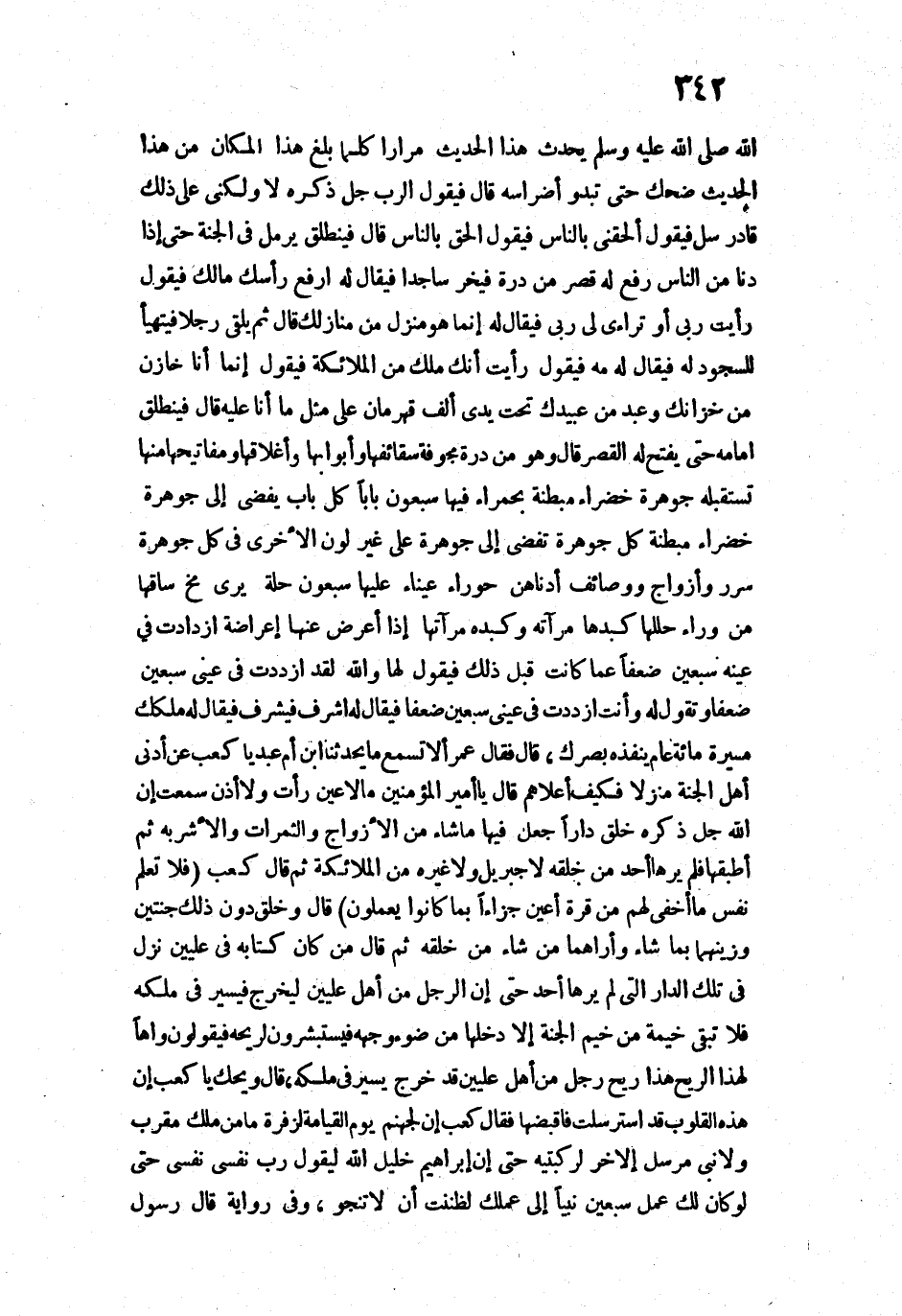 قَالَ: فَقَالَ عُمَرُ: أَلَا تَسْمَعُ مَا يُحَدِّثُنَا ابْنُ أُمِّ عَبْدٍ يَا كَعْبُ عَنْ أَدْنَى أَهْلِ الْجَنَّةِ مَنْزِلًا؟ فَكَيْفَ أَعْلَاهُمْ؟! قَالَ: يَا أَمِيرَ الْمُؤْمِنِينَ، مَا لَا عَيْنٌ رَأَتْ، وَلَا أُذُنٌ سَمِعَتْ، إِنَّ اللَّهَ - جَلَّ ذِكْرُهُ - خَلَقَ دَارًا جَعَلَ فِيهَا مَا شَاءَ مِنَ الْأَزْوَاجِ، وَالثَّمَرَاتِ، وَالْأَشْرِبَةِ، ثُمَّ أَطْبَقَهَا فَلَمْ يَرَهَا أَحَدٌ مِنْ خَلْقِهِ، لَا جِبْرِيلُ وَلَا غَيْرُهُ مِنَ الْمَلَائِكَةِ، ثُمَّ قَالَ كَعْبٌ: {فَلَا تَعْلَمُ نَفْسٌ مَا أُخْفِيَ لَهُمْ مِنْ قُرَّةِ أَعْيُنٍ جَزَاءً بِمَا كَانُوا يَعْمَلُونَ} [السجدة: 17].