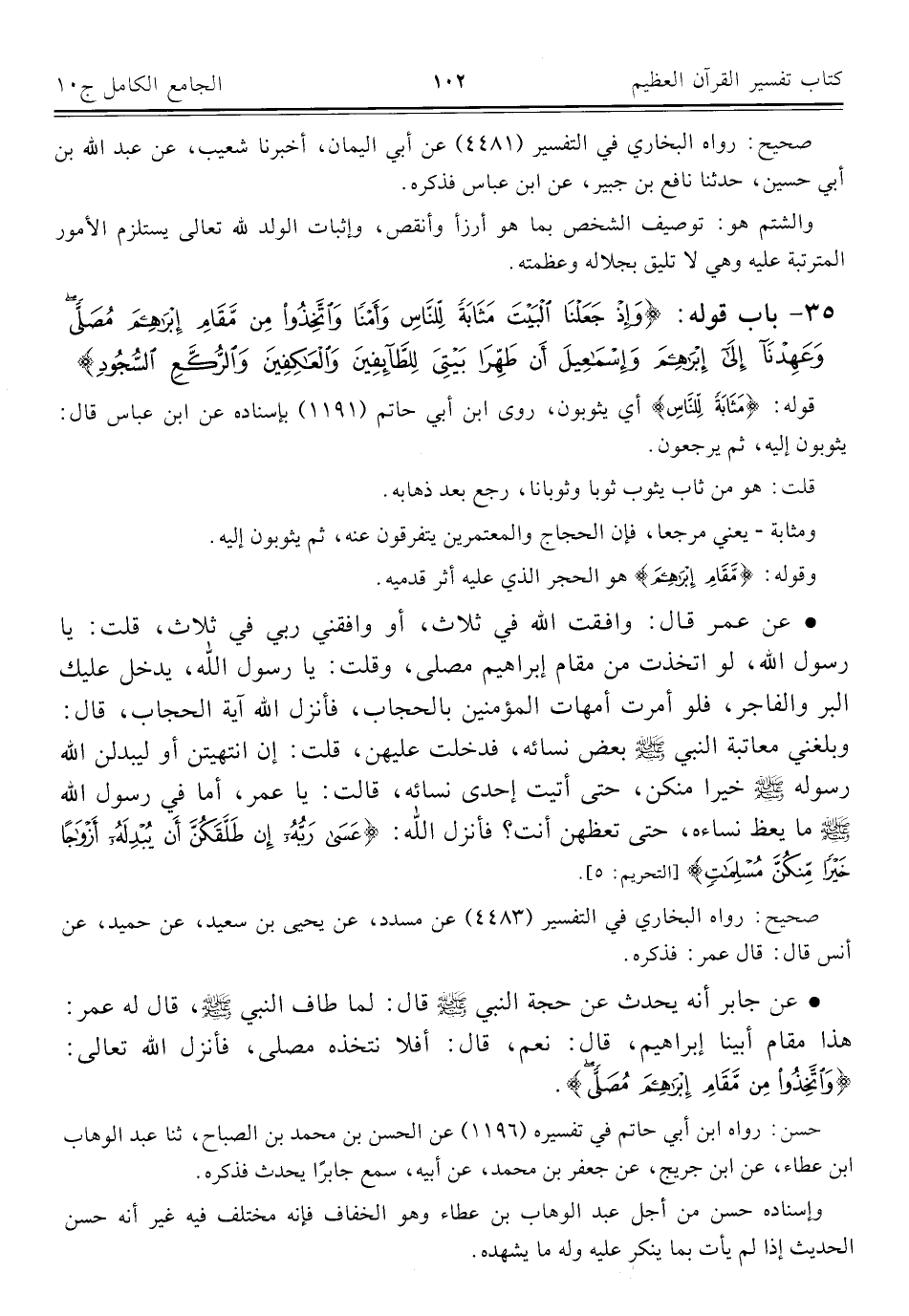 • عن جابر أنه يحدث عن حجة النبي -صلى اللَّه عليه وسلم- قال: لما طاف النبي -صلى اللَّه عليه وسلم-، قال له عمر: هذا مقام أبينا إبراهيم، قال: نعم، قال: أفلا نتخذه مصلى، فأنزل اللَّه تعالى: {وَاتَّخِذُوا مِنْ مَقَامِ إِبْرَاهِيمَ مُصَلًّى}.