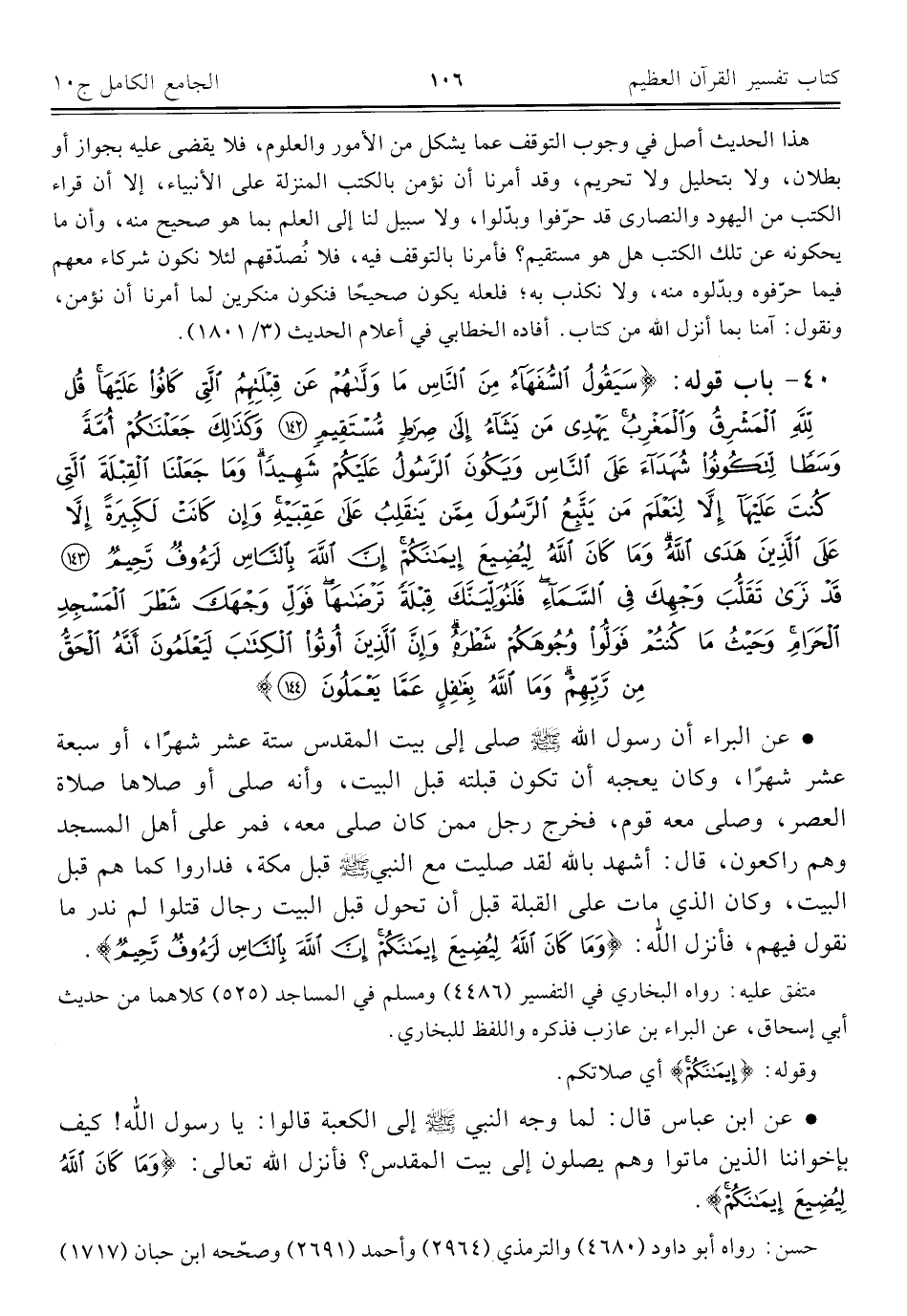 ٤٠ - باب قوله: {سَيَقُولُ السُّفَهَاءُ مِنَ النَّاسِ مَا وَلَّاهُمْ عَنْ قِبْلَتِهِمُ الَّتِي كَانُوا عَلَيْهَا قُلْ لِلَّهِ الْمَشْرِقُ وَالْمَغْرِبُ يَهْدِي مَنْ يَشَاءُ إِلَى صِرَاطٍ مُسْتَقِيمٍ (١٤٢) وَكَذَلِكَ جَعَلْنَاكُمْ أُمَّةً وَسَطًا لِتَكُونُوا شُهَدَاءَ عَلَى النَّاسِ وَيَكُونَ الرَّسُولُ عَلَيْكُمْ شَهِيدًا وَمَا جَعَلْنَا الْقِبْلَةَ الَّتِي كُنْتَ عَلَيْهَا إِلَّا لِنَعْلَمَ مَنْ يَتَّبِعُ الرَّسُولَ مِمَّنْ يَنْقَلِبُ عَلَى عَقِبَيْهِ وَإِنْ كَانَتْ لَكَبِيرَةً إِلَّا عَلَى الَّذِينَ هَدَى اللَّهُ وَمَا كَانَ اللَّهُ لِيُضِيعَ إِيمَانَكُمْ إِنَّ اللَّهَ بِالنَّاسِ لَرَءُوفٌ رَحِيمٌ (١٤٣) قَدْ نَرَى تَقَلُّبَ وَجْهِكَ فِي السَّمَاءِ فَلَنُوَلِّيَنَّكَ قِبْلَةً تَرْضَاهَا فَوَلِّ وَجْهَكَ شَطْرَ الْمَسْجِدِ الْحَرَامِ وَحَيْثُ مَا كُنْتُمْ فَوَلُّوا وُجُوهَكُمْ شَطْرَهُ وَإِنَّ الَّذِينَ أُوتُوا الْكِتَابَ لَيَعْلَمُونَ أَنَّهُ الْحَقُّ مِنْ رَبِّهِمْ وَمَا اللَّهُ بِغَافِلٍ عَمَّا يَعْمَلُونَ (١٤٤)}