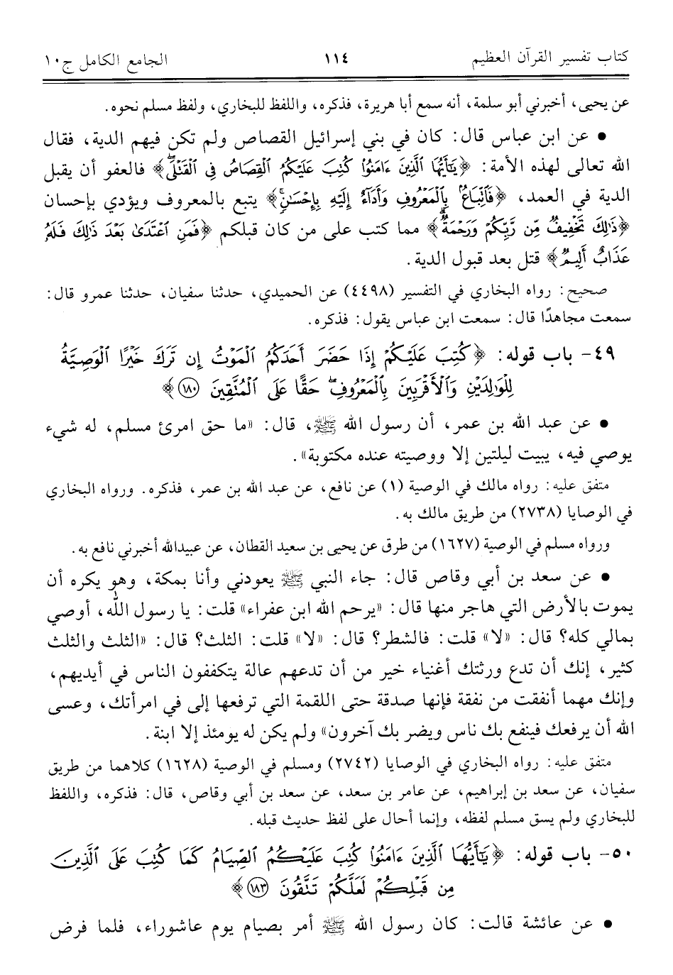 • عن ابن عباس قال: كان في بني إسرائيل القصاص ولم تكن فيهم الدية، فقال اللَّه تعالى لهذه الأمة: {يَاأَيُّهَا الَّذِينَ آمَنُوا كُتِبَ عَلَيْكُمُ الْقِصَاصُ فِي الْقَتْلَى} فالعفو أن يقبل الدية في العمد، {فَاتِّبَاعٌ بِالْمَعْرُوفِ وَأَدَاءٌ إِلَيْهِ بِإِحْسَانٍ} يتبع بالمعروف ويؤدي بإحسان {ذَلِكَ تَخْفِيفٌ مِنْ رَبِّكُمْ وَرَحْمَةٌ} مما كتب على من كان قبلكم {فَمَنِ اعْتَدَى بَعْدَ ذَلِكَ فَلَهُ عَذَابٌ أَلِيمٌ} قتل بعد قبول الدية.