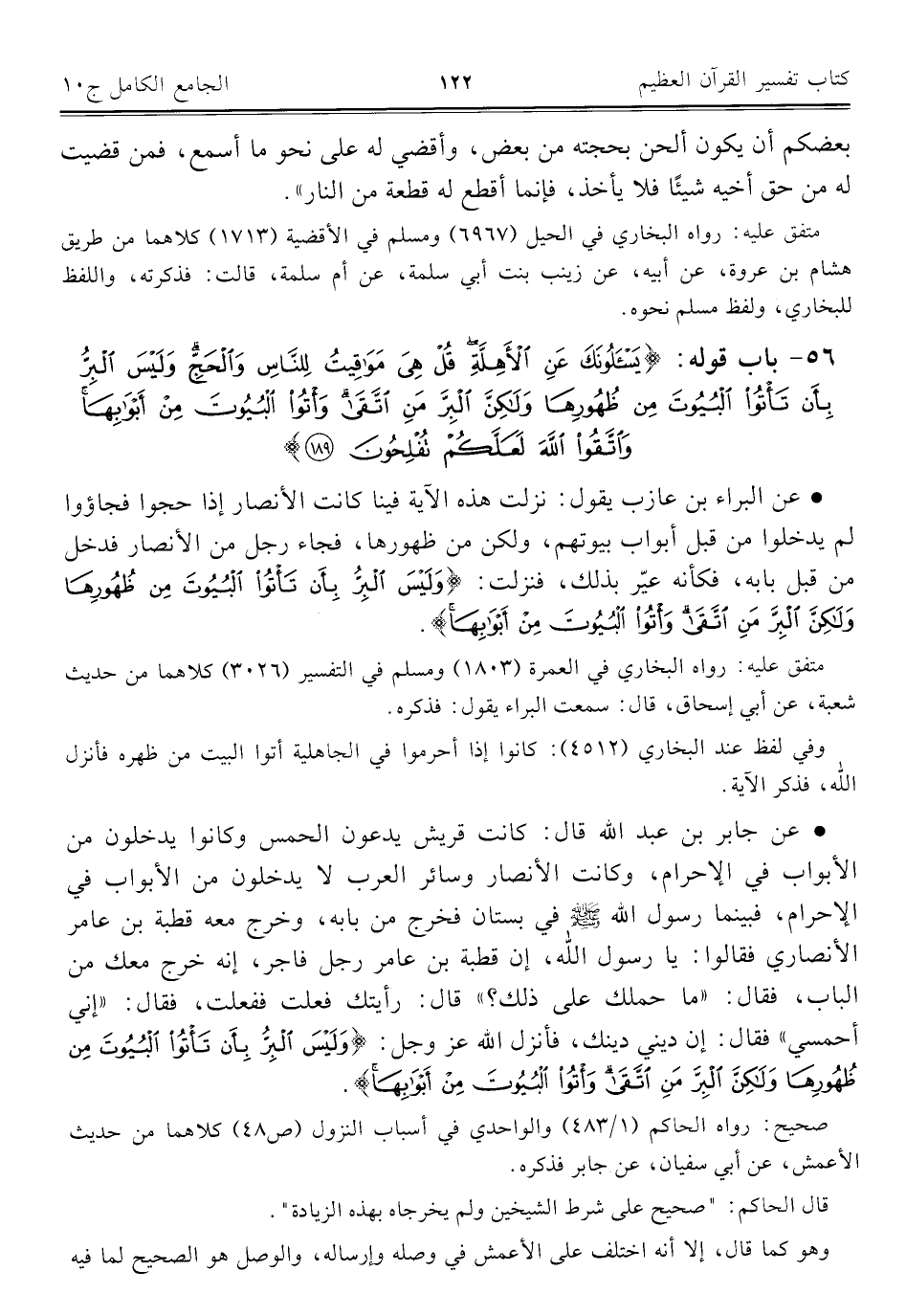 • عن جابر بن عبد اللَّه قال: كانت قريش يدعون الحمس وكانوا يدخلون من الأبواب في الإحرام، وكانت الأنصار وسائر العرب لا يدخلون من الأبواب في الإحرام، فبينما رسول اللَّه -صلى اللَّه عليه وسلم- في بستان فخرج من بابه، وخرج معه قطبة بن عامر الأنصاري فقالوا: يا رسول اللَّه، إن قطبة بن عامر رجل فاجر، إنه خرج معك من الباب، فقال: "ما حملك على ذلك؟ " قال: رأيتك فعلت ففعلت، فقال: "إني أحمسي" فقال: إن ديني دينك، فأنزل اللَّه عزّ وجلّ: {وَلَيْسَ الْبِرُّ بِأَنْ تَأْتُوا الْبُيُوتَ مِنْ ظُهُورِهَا وَلَكِنَّ الْبِرَّ مَنِ اتَّقَى وَأْتُوا الْبُيُوتَ مِنْ أَبْوَابِهَا}.