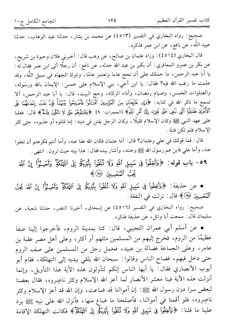 • عن حذيفة: {وَأَنْفِقُوا فِي سَبِيلِ اللَّهِ وَلَا تُلْقُوا بِأَيْدِيكُمْ إِلَى التَّهْلُكَةِ وَأَحْسِنُوا إِنَّ اللَّهَ يُحِبُّ الْمُحْسِنِينَ (١٩٥)} قال: نزلت في النفقة.