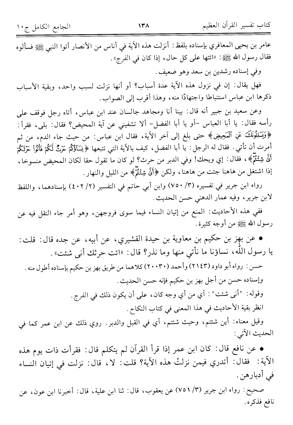 وعن سعيد بن جبير أنه قال: بينا أنا ومجاهد جالسان عند ابن عباس، أتاه رجل فوقف على رأسه فقال: يا أبا العباس -أو يا أبا الفضل- ألا تشفيني عن آية المحيض؟ فقال: بلى، فقرأ: {وَيَسْأَلُونَكَ عَنِ الْمَحِيضِ} حتى بلغ إلى آخر الآية، فقال ابن عباس: من حيث جاء الدم، من ثم أمرت أن تأتي. فقال له الرجل: يا أبا الفضل، كيف بالآية التي تتبعها {نِسَاؤُكُمْ حَرْثٌ لَكُمْ فَأْتُوا حَرْثَكُمْ أَنَّى شِئْتُمْ}، فقال: إي ويحك! وفي الدبر من حرث؟ لو كان ما تقول حقا لكان المحيض منسوخا، إذا اشتغل من هاهنا جئت من هاهنا، ولكن {أَنَّى شِئْتُمْ} من الليل والنهار.