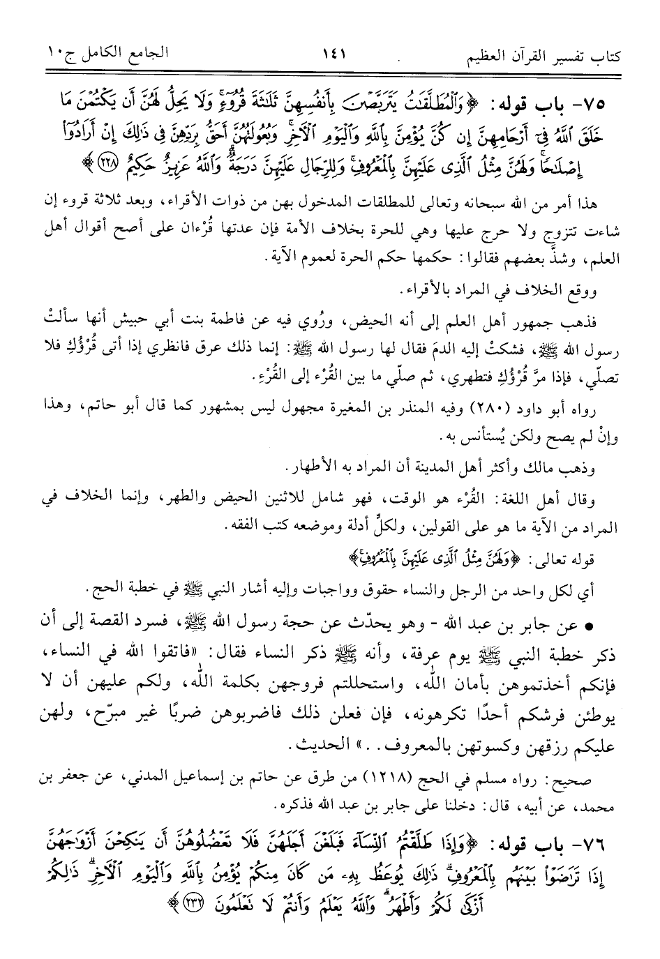 ٧٥ - باب قوله: {وَالْمُطَلَّقَاتُ يَتَرَبَّصْنَ بِأَنْفُسِهِنَّ ثَلَاثَةَ قُرُوءٍ وَلَا يَحِلُّ لَهُنَّ أَنْ يَكْتُمْنَ مَا خَلَقَ اللَّهُ فِي أَرْحَامِهِنَّ إِنْ كُنَّ يُؤْمِنَّ بِاللَّهِ وَالْيَوْمِ الْآخِرِ وَبُعُولَتُهُنَّ أَحَقُّ بِرَدِّهِنَّ فِي ذَلِكَ إِنْ أَرَادُوا إِصْلَاحًا وَلَهُنَّ مِثْلُ الَّذِي عَلَيْهِنَّ بِالْمَعْرُوفِ وَلِلرِّجَالِ عَلَيْهِنَّ دَرَجَةٌ وَاللَّهُ عَزِيزٌ حَكِيمٌ (٢٢٨)}