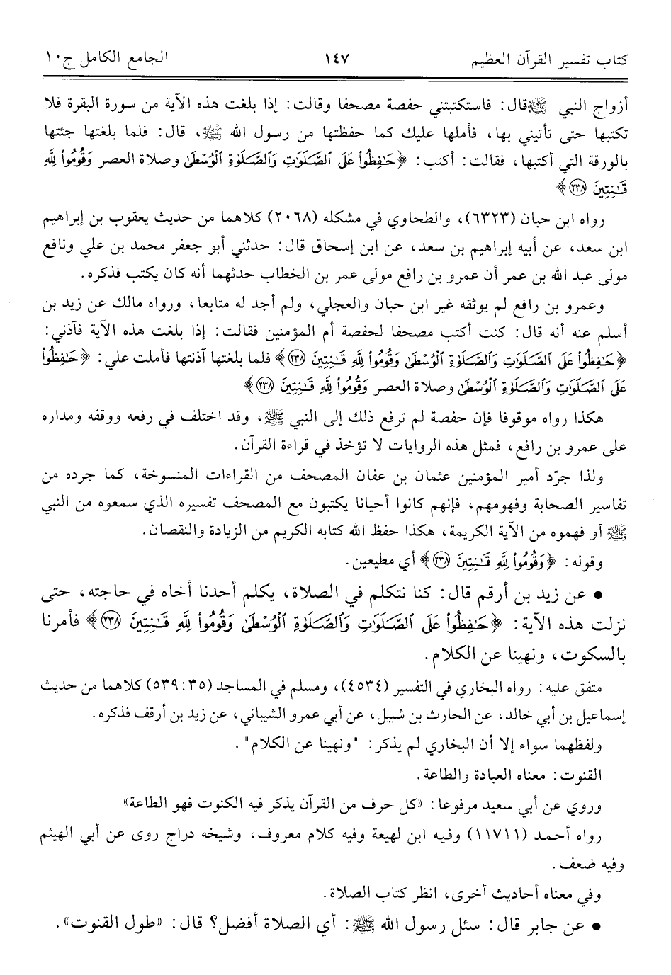 • عن زيد بن أرقم قال: كنا نتكلم في الصلاة، يكلم أحدنا أخاه في حاجته، حتى نزلت هذه الآية {حَافِظُوا عَلَى الصَّلَوَاتِ وَالصَّلَاةِ الْوُسْطَى وَقُومُوا لِلَّهِ قَانِتِينَ (٢٣٨)} فأمرنا بالسكوت، ونهينا عن الكلام.