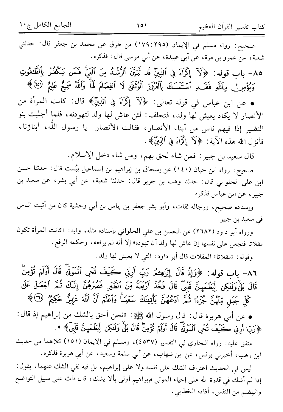 ٨٦ - باب قوله: {وَإِذْ قَالَ إِبْرَاهِيمُ رَبِّ أَرِنِي كَيْفَ تُحْيِ الْمَوْتَى قَالَ أَوَلَمْ تُؤْمِنْ قَالَ بَلَى وَلَكِنْ لِيَطْمَئِنَّ قَلْبِي قَالَ فَخُذْ أَرْبَعَةً مِنَ الطَّيْرِ فَصُرْهُنَّ إِلَيْكَ ثُمَّ اجْعَلْ عَلَى كُلِّ جَبَلٍ مِنْهُنَّ جُزْءًا ثُمَّ ادْعُهُنَّ يَأْتِينَكَ سَعْيًا وَاعْلَمْ أَنَّ اللَّهَ عَزِيزٌ حَكِيمٌ (٢٦٠)}