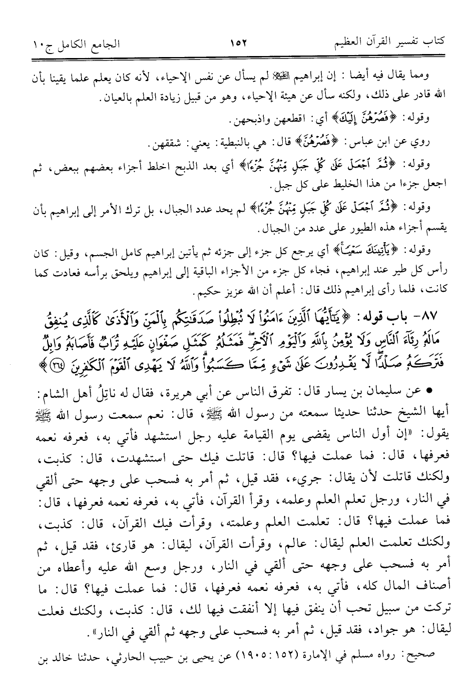 • عن سليمان بن يسار قال: تفرق الناس عن أبي هريرة، فقال له ناتِلُ أهل الشام: أيها الشيخ حدّثنا حديثا سمعته من رسول اللَّه -صلى اللَّه عليه وسلم-، قال: نعم سمعت رسول اللَّه -صلى اللَّه عليه وسلم- يقول: "إن أول الناس يقضى يوم القيامة عليه رجل استشهد فأتي به، فعرفه نعمه فعرفها، قال: فما عملت فيها؟ قال: قاتلت فيك حتى استشهدت، قال: كذبت، ولكنك قاتلت لأن يقال: جريء، فقد قيل، ثم أمر به فسحب على وجهه حتى ألقي في النار، ورجل تعلم العلم وعلمه، وقرأ القرآن، فأتي به، فعرفه نعمه فعرفها، قال: فما عملت فيها؟ قال: تعلمت العلم وعلمته، وقرأت فيك القرآن، قال: كذبت، ولكنك تعلمت العلم ليقال: عالم، وقرأت القرآن، ليقال: هو قارئ، فقد قيل، ثم أمر به فسحب على وجهه حتى ألقي في النار، ورجل وسع اللَّه عليه وأعطاه من أصناف المال كله، فأتي به، فعرفه نعمه فعرفها، قال: فما عملت فيها؟ قال: ما تركت من سبيل تحب أن ينفق فيها إلا أنفقت فيها لك، قال: كذبت، ولكنك فعلت ليقال: هو جواد، فقد قيل، ثم أمر به فسحب على وجهه ثم ألقي في النار".