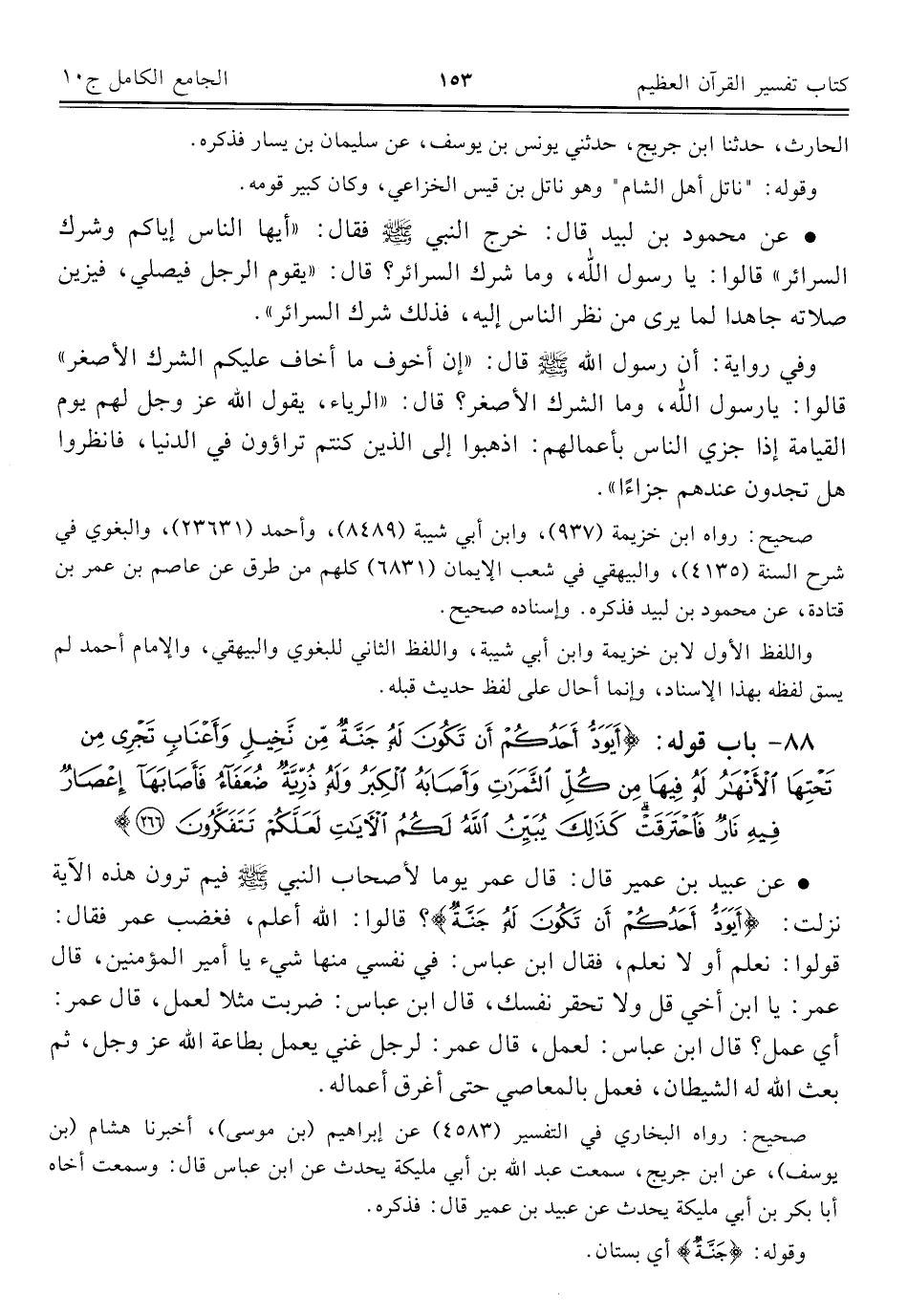 • عن عبيد بن عمير قال: قال عمر يوما لأصحاب النبي -صلى اللَّه عليه وسلم- فيم ترون هذه الآية نزلت: {أَيَوَدُّ أَحَدُكُمْ أَنْ تَكُونَ لَهُ جَنَّةٌ}؟ قالوا: اللَّه أعلم، فغضب عمر فقال: قولوا: نعلم أو لا نعلم، فقال ابن عباس: في نفسي منها شيء يا أمير المؤمنين، قال عمر: يا ابن أخي قل ولا تحقر نفسك، قال ابن عباس: ضربت مثلا لعمل، قال عمر: أي عمل؟ قال ابن عباس: لعمل، قال عمر: لرجل غني يعمل بطاعة اللَّه عز وجل، ثم بعث اللَّه له الشيطان، فعمل بالمعاصي حتى أغرق أعماله.