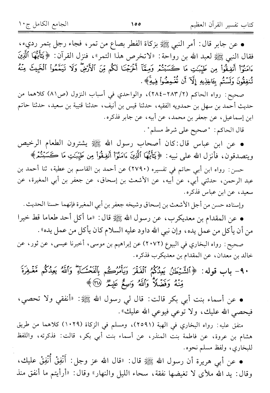 • عن جابر قال: أمر النبي -صلى اللَّه عليه وسلم- بزكاة الفطر بصاع من تمر، فجاء رجل بتمر رديء، فقال النبي -صلى اللَّه عليه وسلم- لعبد اللَّه بن رواحة: "لا تخرص هذا التمر"، فنزل القرآن: {يَاأَيُّهَا الَّذِينَ آمَنُوا أَنْفِقُوا مِنْ طَيِّبَاتِ مَا كَسَبْتُمْ وَمِمَّا أَخْرَجْنَا لَكُمْ مِنَ الْأَرْضِ وَلَا تَيَمَّمُوا الْخَبِيثَ مِنْهُ تُنْفِقُونَ وَلَسْتُمْ بِآخِذِيهِ إلا أَنْ تُغْمِضُوا فِيهِ}.