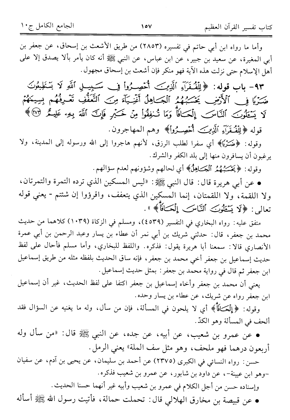 ٩٣ - باب قوله: {لِلْفُقَرَاءِ الَّذِينَ أُحْصِرُوا فِي سَبِيلِ اللَّهِ لَا يَسْتَطِيعُونَ ضَرْبًا فِي الْأَرْضِ يَحْسَبُهُمُ الْجَاهِلُ أَغْنِيَاءَ مِنَ التَّعَفُّفِ تَعْرِفُهُمْ بِسِيمَاهُمْ لَا يَسْأَلُونَ النَّاسَ إِلْحَافًا وَمَا تُنْفِقُوا مِنْ خَيْرٍ فَإِنَّ اللَّهَ بِهِ عَلِيمٌ (٢٧٣)}