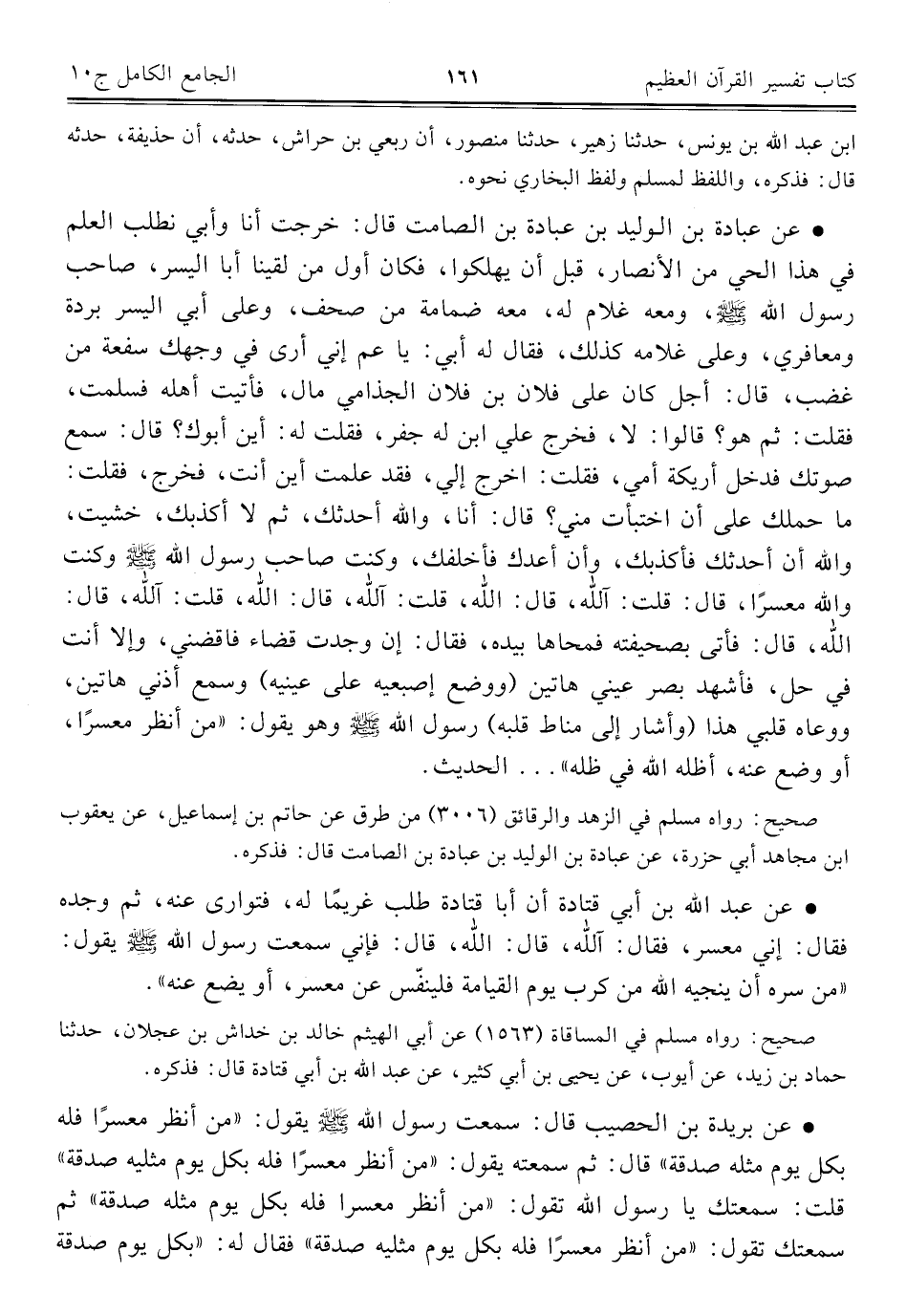 • عن عبادة بن الوليد بن عبادة بن الصامت قال: خرجت أنا وأبي نطلب العلم في هذا الحي من الأنصار، قبل أن يهلكوا، فكان أول من لقينا أبا اليسر، صاحب رسول اللَّه -صلى اللَّه عليه وسلم-، ومعه غلام له، معه ضمامة من صحف، وعلى أبي أليسر بردة ومعافري، وعلى غلامه كذلك، فقال له أبي: يا عم إني أرى في وجهك سفعة من غضب، قال: أجل كان على فلان بن فلان الجذامي مال، فأتيت أهله فسلمت، فقلت: ثم هو؟ قالوا: لا، فخرج علي ابن له جفر، فقلت له: أين أبوك؟ قال: سمع صوتك فدخل أريكة أمي، فقلت: اخرج إلي، فقد علمت أين أنت، فخرج، فقلت: ما حملك على أن اختبأت مني؟ قال: أنا، واللَّه أحدثك، ثم لا أكذبك، خشيت، واللَّه أن أحدثك فأكذبك، وأن أعدك فأخلفك، وكنت صاحب رسول اللَّه -صلى اللَّه عليه وسلم- وكنت واللَّه معسرًا، قال: قلت: اللَّه، قال: اللَّه، قلت: اللَّه، قال: اللَّه، قلت: اللَّه، قال: اللَّه، قال: فأتى بصحيفته فمحاها بيده، فقال: إن وجدت قضاء فاقضني، وإلا أنت في حل، فأشهد بصر عيني هاتين (ووضع إصبعيه على عينيه) وسمع أذني هاتين، ووعاه قلبي هذا (وأشار إلى مناط قلبه) رسول اللَّه -صلى اللَّه عليه وسلم- وهو يقول: "من أنظر معسرًا، أو وضع عنه، أظله اللَّه في ظله". . . الحديث.