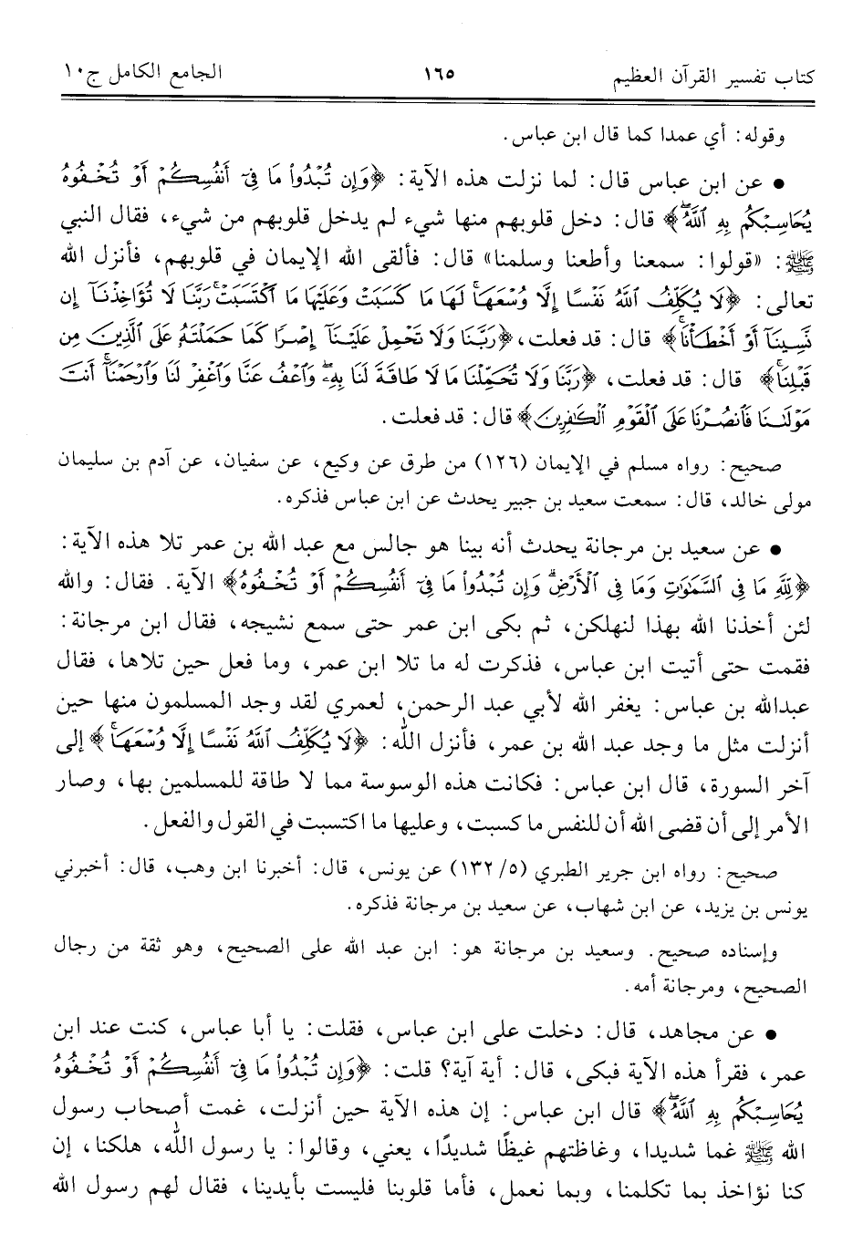 • عن سعيد بن مرجانة يحدث أنه بينا هو جالس مع عبد اللَّه بن عمر تلا هذه الآية: {لِلَّهِ مَا فِي السَّمَاوَاتِ وَمَا فِي الْأَرْضِ وَإِنْ تُبْدُوا مَا فِي أَنْفُسِكُمْ أَوْ تُخْفُوهُ} الآية. فقال: واللَّه لئن أخذنا اللَّه بهذا لنهلكن، ثم بكى ابن عمر حتى سمع نشيجه، فقال ابن مرجانة: فقمت حتى أتيت ابن عباس، فذكرت له ما تلا ابن عمر، وما فعل حين تلاها، فقال عبد اللَّه بن عباس: يغفر اللَّه لأبي عبد الرحمن، لعمري لقد وجد المسلمون منها حين أنزلت مثل ما وجد عبد اللَّه بن عمر، فأنزل اللَّه: {لَا يُكَلِّفُ اللَّهُ نَفْسًا إِلَّا وُسْعَهَا} إلى آخر السورة، قال ابن عباس: فكانت هذه الوسوسة مما لا طاقة للمسلمين بها، وصار الأمر إلى أن قضى اللَّه أن للنفس ما كسبت، وعليها ما اكتسبت في القول والفعل.