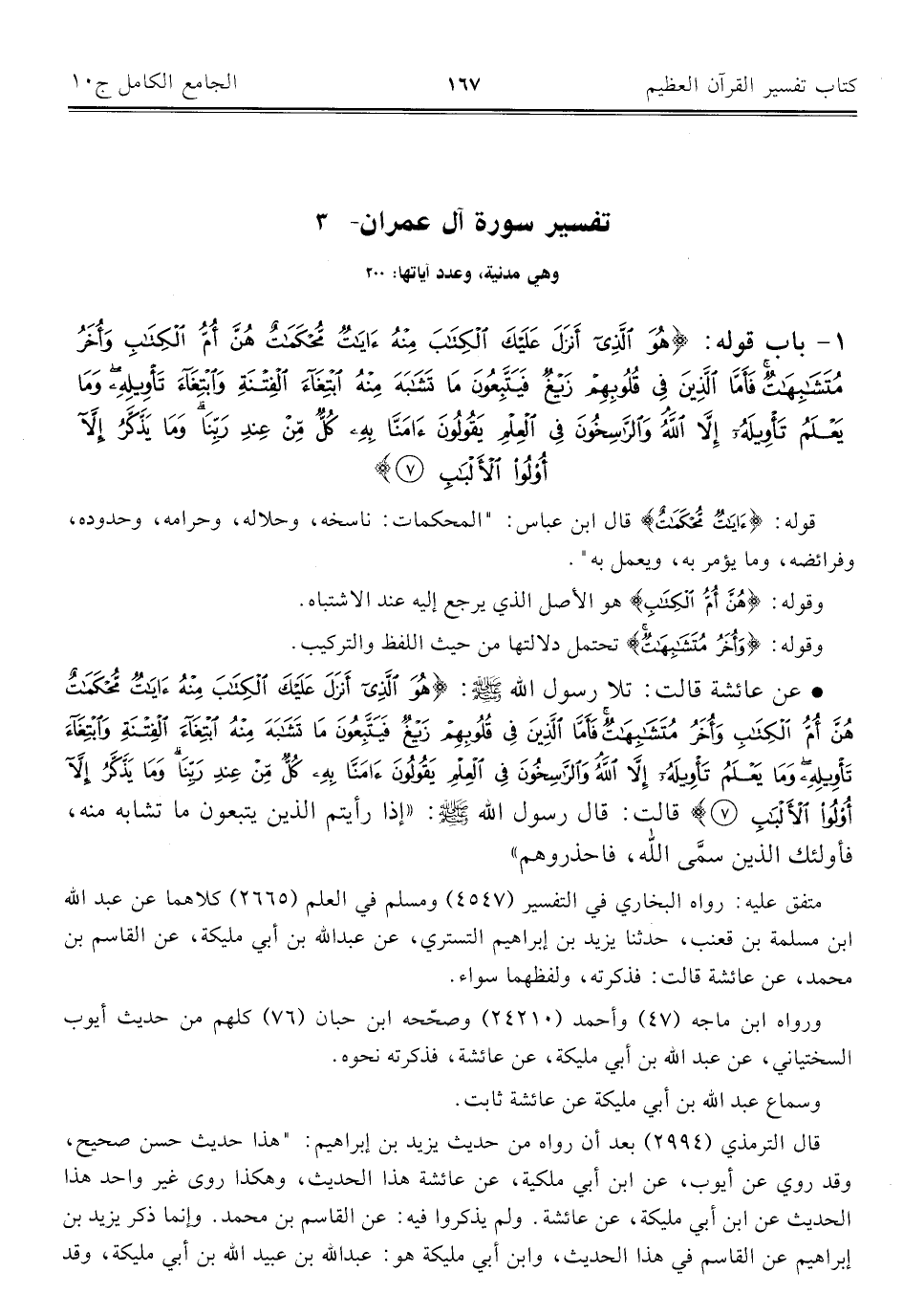 • عن عائشة قالت: تلا رسول اللَّه -صلى اللَّه عليه وسلم-: {هُوَ الَّذِي أَنْزَلَ عَلَيْكَ الْكِتَابَ مِنْهُ آيَاتٌ مُحْكَمَاتٌ هُنَّ أُمُّ الْكِتَابِ وَأُخَرُ مُتَشَابِهَاتٌ فَأَمَّا الَّذِينَ فِي قُلُوبِهِمْ زَيْغٌ فَيَتَّبِعُونَ مَا تَشَابَهَ مِنْهُ ابْتِغَاءَ الْفِتْنَةِ وَابْتِغَاءَ تَأْوِيلِهِ وَمَا يَعْلَمُ تَأْوِيلَهُ إِلَّا اللَّهُ وَالرَّاسِخُونَ فِي الْعِلْمِ يَقُولُونَ آمَنَّا بِهِ كُلٌّ مِنْ عِنْدِ رَبِّنَا وَمَا يَذَّكَّرُ إلا أُولُو الْأَلْبَابِ (٧)} قالت: قال رسول اللَّه -صلى اللَّه عليه وسلم-: "إذا رأيتم الذين يتبعون ما تشابه منه، فأولئك الذين سمَّى اللَّه، فاحذروهم".