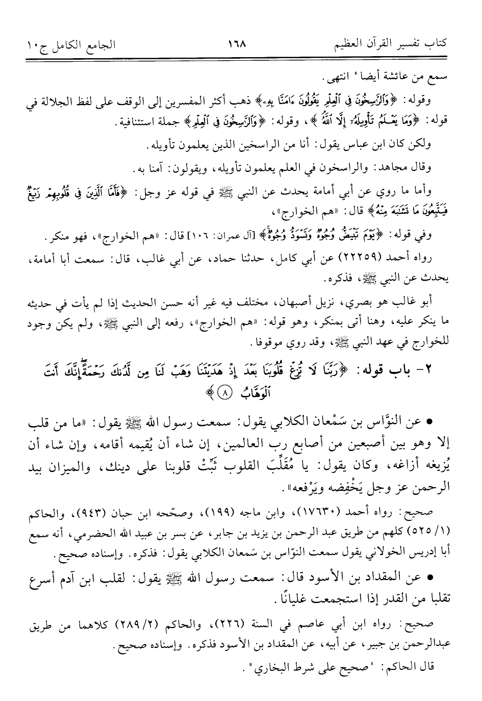 وأما ما روي عن أبي أمامة يحدث عن النبي -صلى اللَّه عليه وسلم- في قوله عز وجل: {فَأَمَّا الَّذِينَ فِي قُلُوبِهِمْ زَيْغٌ فَيَتَّبِعُونَ مَا تَشَابَهَ مِنْهُ} قال: "هم الخوارج".