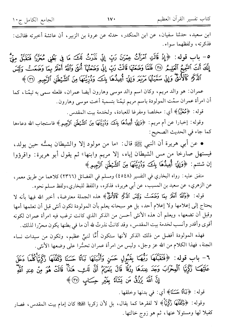 ٥ - باب قوله: {إِذْ قَالَتِ امْرَأَتُ عِمْرَانَ رَبِّ إِنِّي نَذَرْتُ لَكَ مَا فِي بَطْنِي مُحَرَّرًا فَتَقَبَّلْ مِنِّي إِنَّكَ أَنْتَ السَّمِيعُ الْعَلِيمُ (٣٥) فَلَمَّا وَضَعَتْهَا قَالَتْ رَبِّ إِنِّي وَضَعْتُهَا أُنْثَى وَاللَّهُ أَعْلَمُ بِمَا وَضَعَتْ وَلَيْسَ الذَّكَرُ كَالْأُنْثَى وَإِنِّي سَمَّيْتُهَا مَرْيَمَ وَإِنِّي أُعِيذُهَا بِكَ وَذُرِّيَّتَهَا مِنَ الشَّيْطَانِ الرَّجِيمِ (٣٦)}