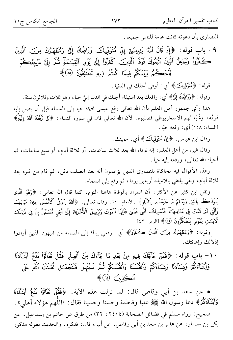 ١٠ - باب قوله: {فَمَنْ حَاجَّكَ فِيهِ مِنْ بَعْدِ مَا جَاءَكَ مِنَ الْعِلْمِ فَقُلْ تَعَالَوْا نَدْعُ أَبْنَاءَنَا وَأَبْنَاءَكُمْ وَنِسَاءَنَا وَنِسَاءَكُمْ وَأَنْفُسَنَا وَأَنْفُسَكُمْ ثُمَّ نَبْتَهِلْ فَنَجْعَلْ لَعْنَتَ اللَّهِ عَلَى الْكَاذِبِينَ (٦١)}