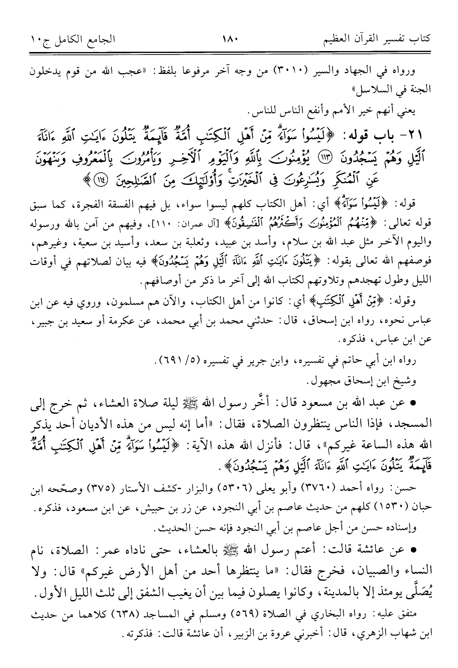 • عن عبد اللَّه بن مسعود قال: أخَّر رسول اللَّه -صلى اللَّه عليه وسلم- ليلة صلاة العشاء، ثم خرج إلى المسجد، فإذا الناس ينتظرون الصلاة، فقال: "أما إنه ليس من هذه الأديان أحد يذكر اللَّه هذه الساعة غيركم"، قال: فأنزل اللَّه هذه الآية: {لَيْسُوا سَوَاءً مِنْ أَهْلِ الْكِتَابِ أُمَّةٌ قَائِمَةٌ يَتْلُونَ آيَاتِ اللَّهِ آنَاءَ اللَّيْلِ وَهُمْ يَسْجُدُونَ}.
