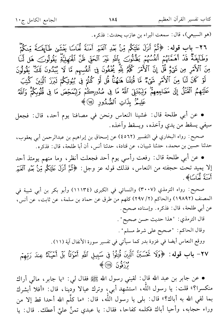 ٢٧ - باب قوله: {وَلَا تَحْسَبَنَّ الَّذِينَ قُتِلُوا فِي سَبِيلِ اللَّهِ أَمْوَاتًا بَلْ أَحْيَاءٌ عِنْدَ رَبِّهِمْ يُرْزَقُونَ (١٦٩)}