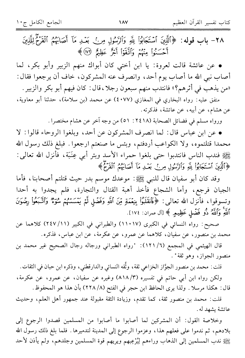 ٢٨ - باب قوله: {الَّذِينَ اسْتَجَابُوا لِلَّهِ وَالرَّسُولِ مِنْ بَعْدِ مَا أَصَابَهُمُ الْقَرْحُ لِلَّذِينَ أَحْسَنُوا مِنْهُمْ وَاتَّقَوْا أَجْرٌ عَظِيمٌ (١٧٢)}