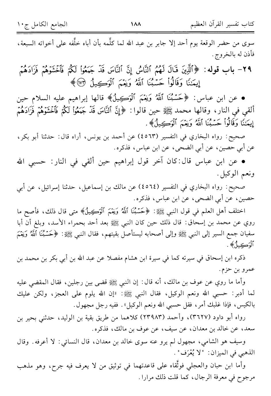 ٢٩ - باب قوله: {الَّذِينَ قَالَ لَهُمُ النَّاسُ إِنَّ النَّاسَ قَدْ جَمَعُوا لَكُمْ فَاخْشَوْهُمْ فَزَادَهُمْ إِيمَانًا وَقَالُوا حَسْبُنَا اللَّهُ وَنِعْمَ الْوَكِيلُ (١٧٣)}