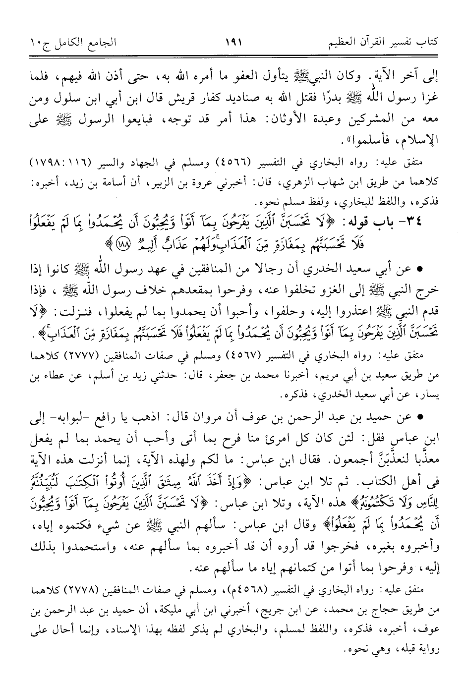 • عن حميد بن عبد الرحمن بن عوف أن مروان قال: اذهب يا رافع -لبوابه- إلى ابن عباس فقل: لئن كان كل امرئ منا فرح بما أتى وأحب أن يحمد بما لم يفعل معذَّبا لنعذَّبَنَّ أجمعون. فقال ابن عباس: ما لكم ولهذه الآية، إنما أنزلت هذه الآية فى أهل الكتاب. ثم تلا ابن عباس: {وَإِذْ أَخَذَ اللَّهُ مِيثَاقَ الَّذِينَ أُوتُوا الْكِتَابَ لَتُبَيِّنُنَّهُ لِلنَّاسِ وَلَا تَكْتُمُونَهُ} هذه الآية، وتلا ابن عباس: {لَا تَحْسَبَنَّ الَّذِينَ يَفْرَحُونَ بِمَا أَتَوْا وَيُحِبُّونَ أَنْ يُحْمَدُوا بِمَا لَمْ يَفْعَلُوا} وقال ابن عباس: سألهم النبي -صلى اللَّه عليه وسلم- عن شيء فكتموه إياه، وأخبروه بغيره، فخرجوا قد أروه أن قد أخبروه بما سألهم عنه، واستحمدوا بذلك إليه، وفرحوا بما أتوا من كتمانهم إياه ما سألهم عنه.