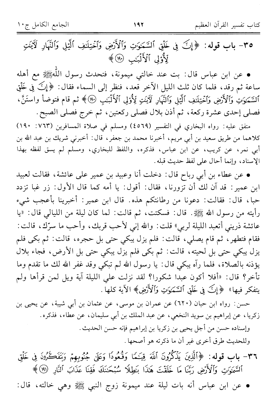 ٣٥ - باب قوله: {إِنَّ فِي خَلْقِ السَّمَاوَاتِ وَالْأَرْضِ وَاخْتِلَافِ اللَّيْلِ وَالنَّهَارِ لَآيَاتٍ لِأُولِي الْأَلْبَابِ (١٩٠)}