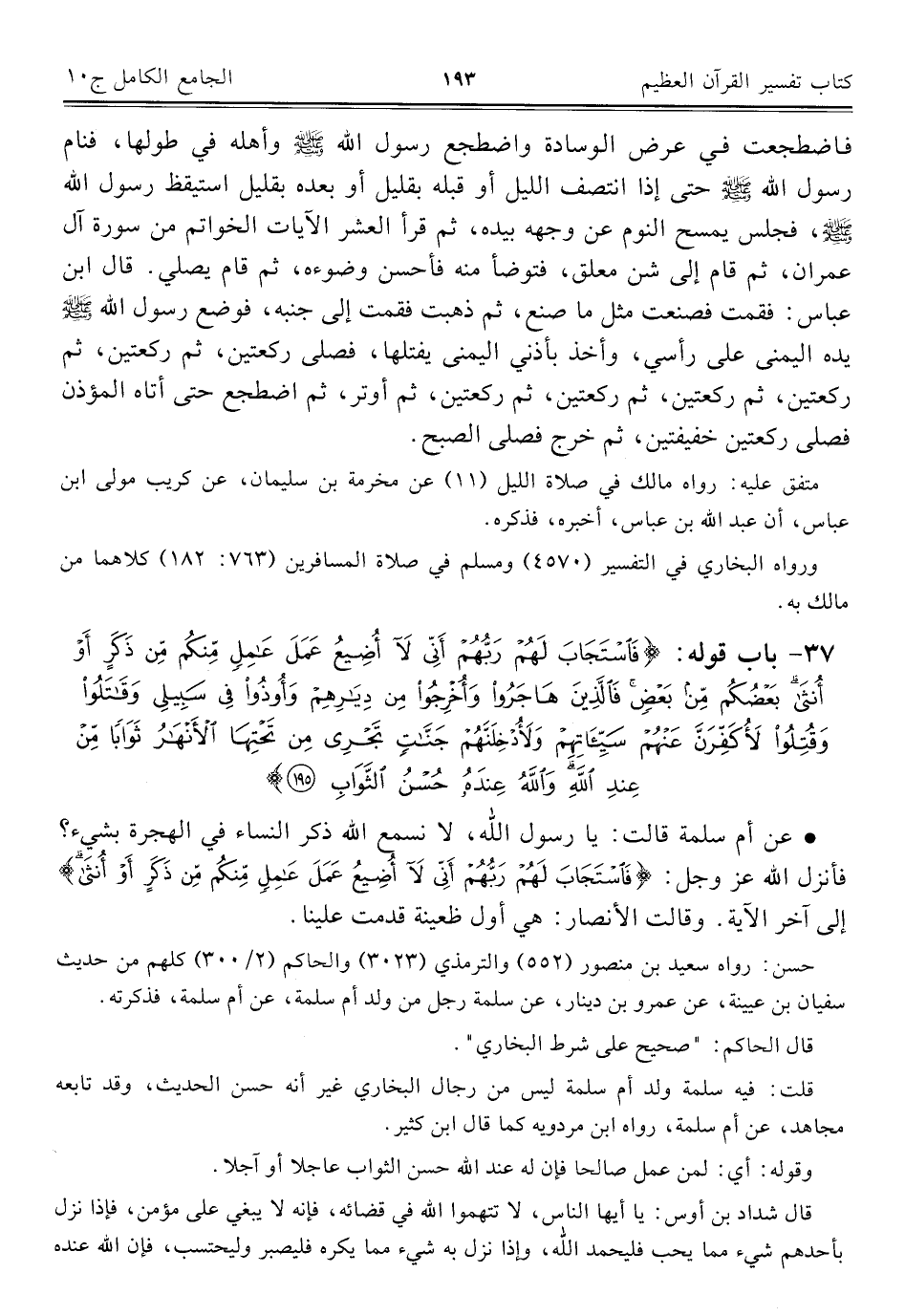٣٧ - باب قوله: {فَاسْتَجَابَ لَهُمْ رَبُّهُمْ أَنِّي لَا أُضِيعُ عَمَلَ عَامِلٍ مِنْكُمْ مِنْ ذَكَرٍ أَوْ أُنْثَى بَعْضُكُمْ مِنْ بَعْضٍ فَالَّذِينَ هَاجَرُوا وَأُخْرِجُوا مِنْ دِيَارِهِمْ وَأُوذُوا فِي سَبِيلِي وَقَاتَلُوا وَقُتِلُوا لَأُكَفِّرَنَّ عَنْهُمْ سَيِّئَاتِهِمْ وَلَأُدْخِلَنَّهُمْ جَنَّاتٍ تَجْرِي مِنْ تَحْتِهَا الْأَنْهَارُ ثَوَابًا مِنْ عِنْدِ اللَّهِ وَاللَّهُ عِنْدَهُ حُسْنُ الثَّوَابِ (١٩٥)}