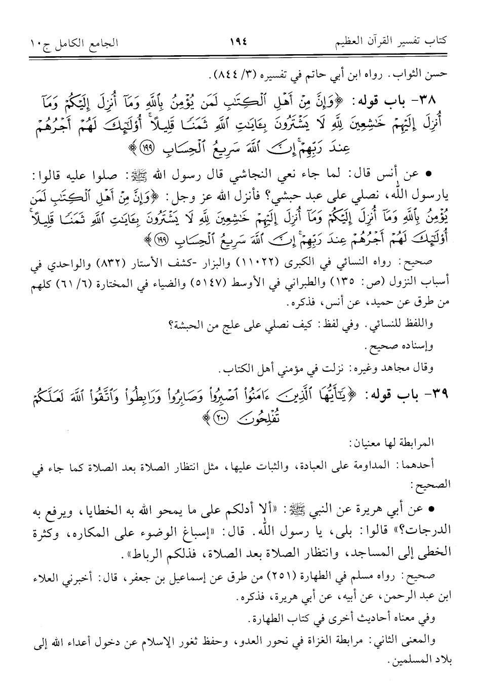 ٣٩ - باب قوله: {يَاأَيُّهَا الَّذِينَ آمَنُوا اصْبِرُوا وَصَابِرُوا وَرَابِطُوا وَاتَّقُوا اللَّهَ لَعَلَّكُمْ تُفْلِحُونَ (٢٠٠)}