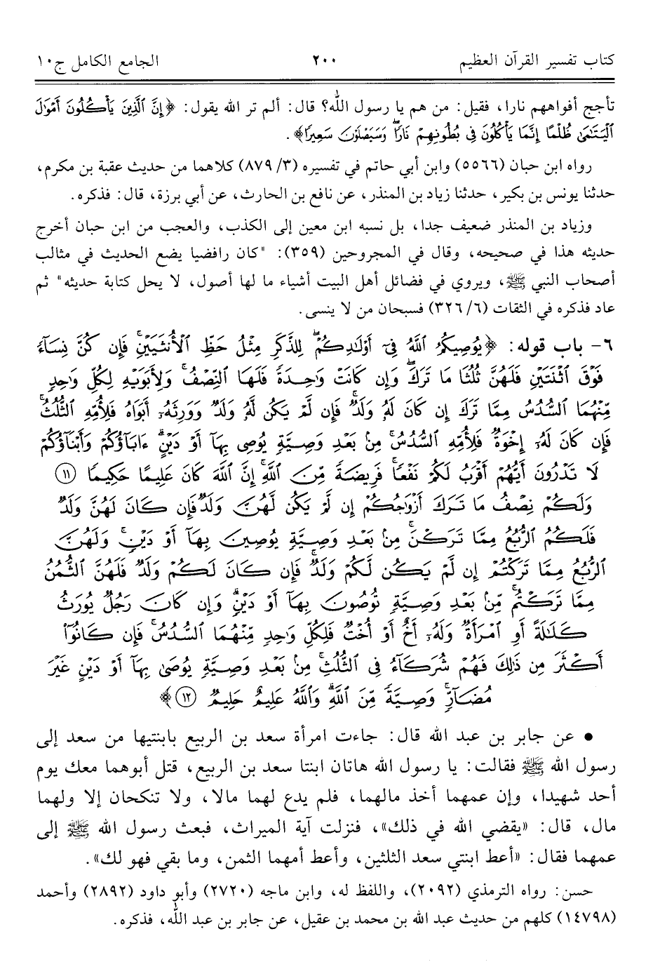 • عن جابر بن عبد اللَّه قال: جاءت امرأة سعد بن الربيع بابنتيها من سعد إلى رسول اللَّه -صلى اللَّه عليه وسلم- فقالت: يا رسول اللَّه هاتان ابنتا سعد بن الربيع، قتل أبوهما معك يوم أحد شهيدا، وإن عمهما أخذ مالهما، فلم يدع لهما مالا، ولا تنكحان إلا ولهما مال، قال: "يقضي اللَّه في ذلك"، فنزلت آية الميراث، فبعث رسول اللَّه -صلى اللَّه عليه وسلم- إلى عمهما فقال: "أعط ابنتي سعد الثلثين، وأعط أمهما الثمن، وما بقي فهو لك".