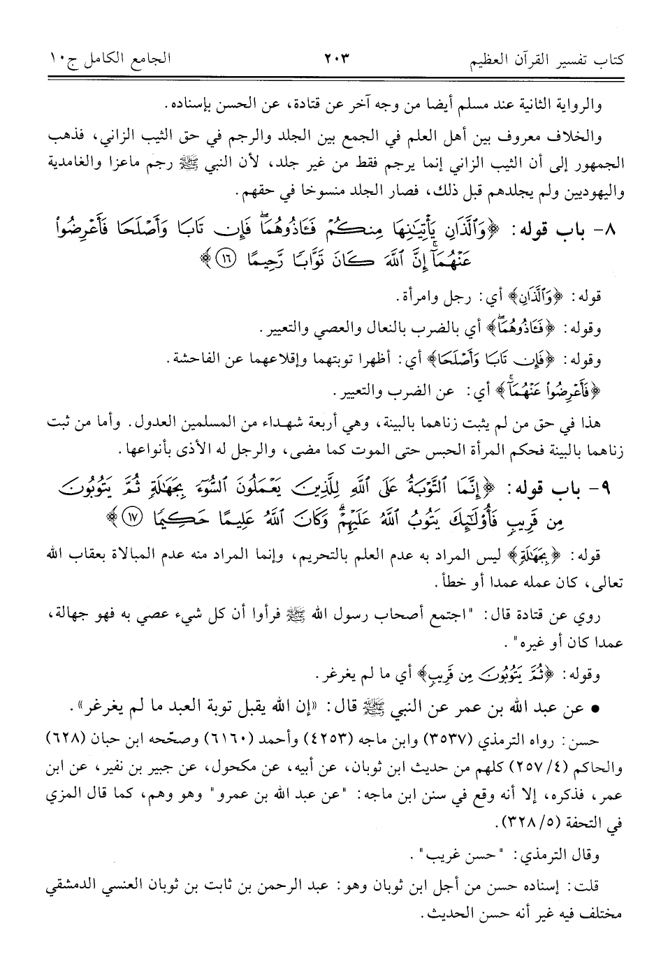٨ - باب قوله: {وَاللَّذَانِ يَأْتِيَانِهَا مِنْكُمْ فَآذُوهُمَا فَإِنْ تَابَا وَأَصْلَحَا فَأَعْرِضُوا عَنْهُمَا إِنَّ اللَّهَ كَانَ تَوَّابًا رَحِيمًا (١٦)}