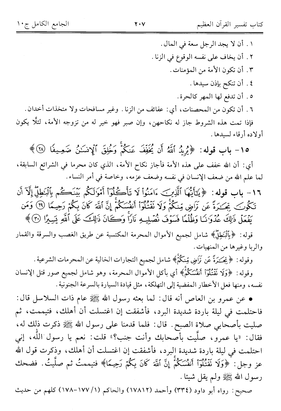 • عن عمرو بن العاص أنه قال: لما بعثه رسول اللَّه -صلى اللَّه عليه وسلم- عام ذات السلاسل قال: فاحتلمت في ليلة باردة شديدة البرد، فأشفقت إن اغتسلت أن أهلك، فتيممت، ثم صليت بأصحابي صلاة الصبح. قال: فلما قدمنا على رسول اللَّه -صلى اللَّه عليه وسلم- ذكرت ذلك له، فقال: "يا عمرو، صلَّيت بأصحابك وأنت جنب؟ " قلت: نعم يا رسول اللَّه، إني احتلمت في ليلة باردة شديدة البرد، فأشفقت إن اغتسلت أن أهلك، وذكرت قول اللَّه عز وجل: {وَلَا تَقْتُلُوا أَنْفُسَكُمْ إِنَّ اللَّهَ كَانَ بِكُمْ رَحِيمًا} فتيممتُ ثم صلَّيتُ. فضحك رسول اللَّه -صلى اللَّه عليه وسلم- ولم يقل شيئًا.