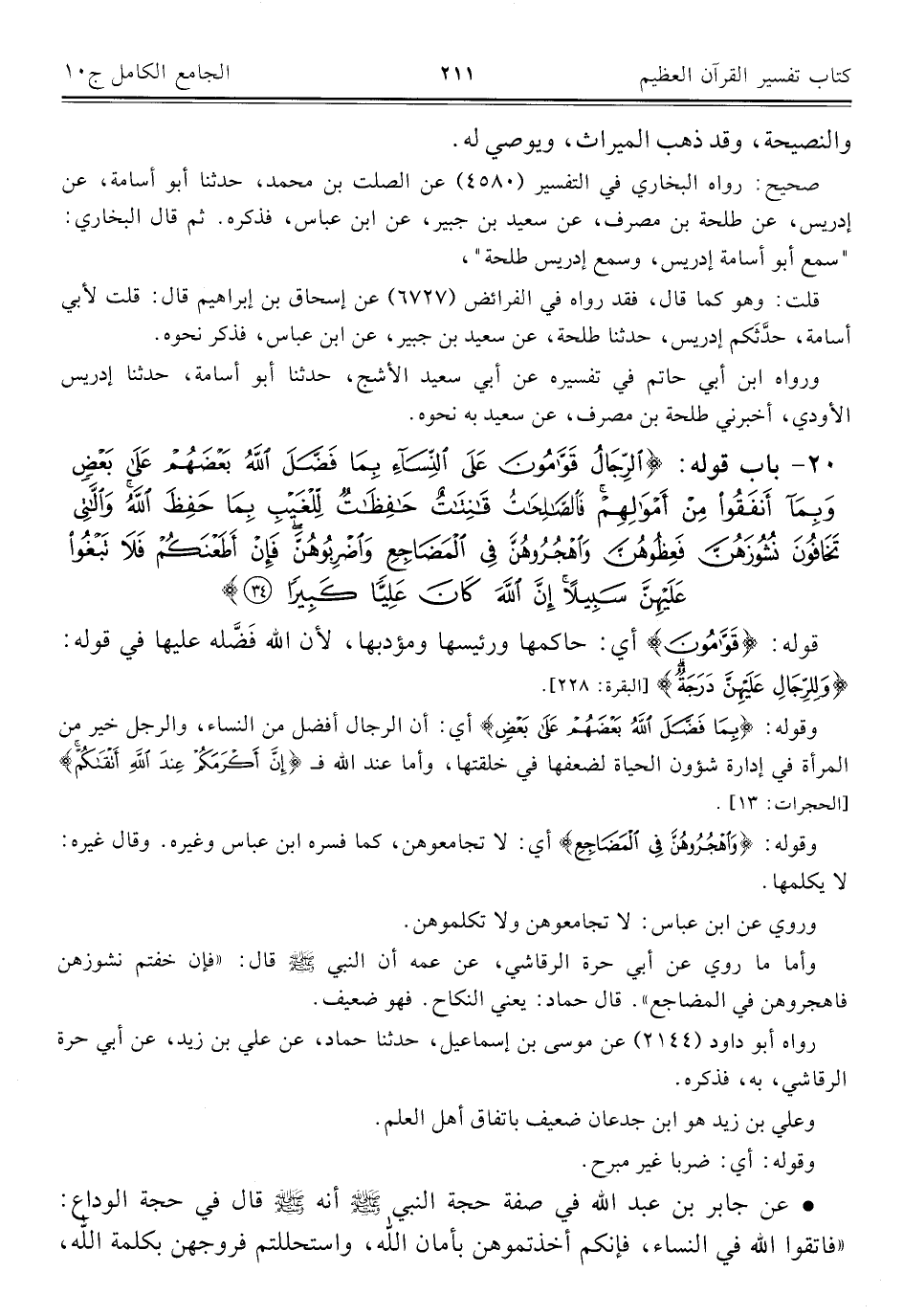 ٢٠ - باب قوله: {الرِّجَالُ قَوَّامُونَ عَلَى النِّسَاءِ بِمَا فَضَّلَ اللَّهُ بَعْضَهُمْ عَلَى بَعْضٍ وَبِمَا أَنْفَقُوا مِنْ أَمْوَالِهِمْ فَالصَّالِحَاتُ قَانِتَاتٌ حَافِظَاتٌ لِلْغَيْبِ بِمَا حَفِظَ اللَّهُ وَاللَّاتِي تَخَافُونَ نُشُوزَهُنَّ فَعِظُوهُنَّ وَاهْجُرُوهُنَّ فِي الْمَضَاجِعِ وَاضْرِبُوهُنَّ فَإِنْ أَطَعْنَكُمْ فَلَا تَبْغُوا عَلَيْهِنَّ سَبِيلًا إِنَّ اللَّهَ كَانَ عَلِيًّا كَبِيرًا (٣٤)}