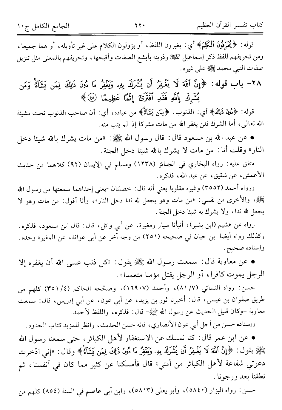 • عن ابن عمر قال: كنا نمسك عن الاستغفار لأهل الكبائر، حتى سمعنا رسول اللَّه -صلى اللَّه عليه وسلم- يقول: {إِنَّ اللَّهَ لَا يَغْفِرُ أَنْ يُشْرَكَ بِهِ وَيَغْفِرُ مَا دُونَ ذَلِكَ لِمَنْ يَشَاءُ} وقال: "إني ادّخرت دعوتي شفاعة لأهل الكبائر من أمتي" قال فأمسكنا عن كثير مما كان في أنفسنا، ثم نطقنا بعد ورجونا.