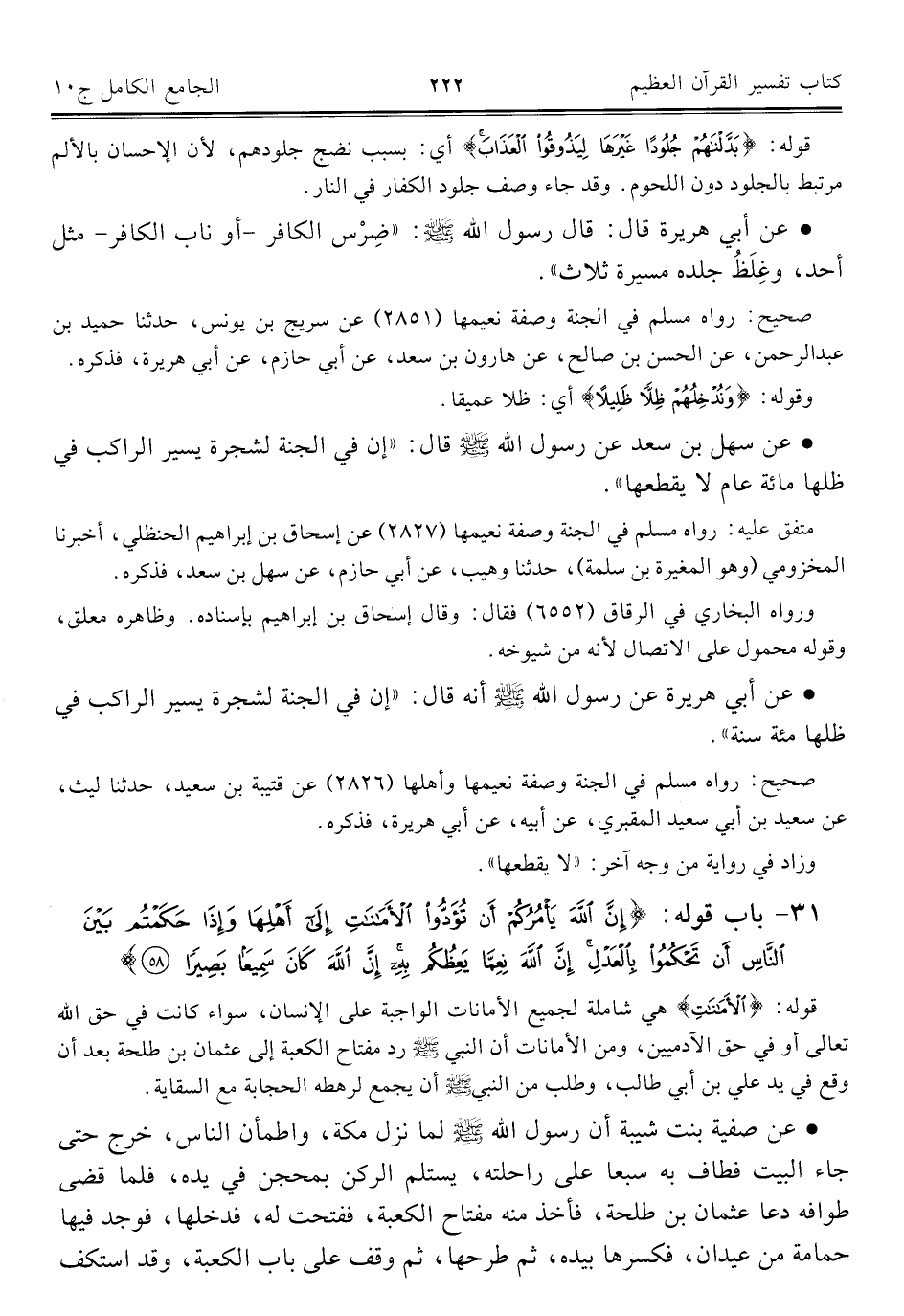 ٣١ - باب قوله: {إِنَّ اللَّهَ يَأْمُرُكُمْ أَنْ تُؤَدُّوا الْأَمَانَاتِ إِلَى أَهْلِهَا وَإِذَا حَكَمْتُمْ بَيْنَ النَّاسِ أَنْ تَحْكُمُوا بِالْعَدْلِ إِنَّ اللَّهَ نِعِمَّا يَعِظُكُمْ بِهِ إِنَّ اللَّهَ كَانَ سَمِيعًا بَصِيرًا (٥٨)}