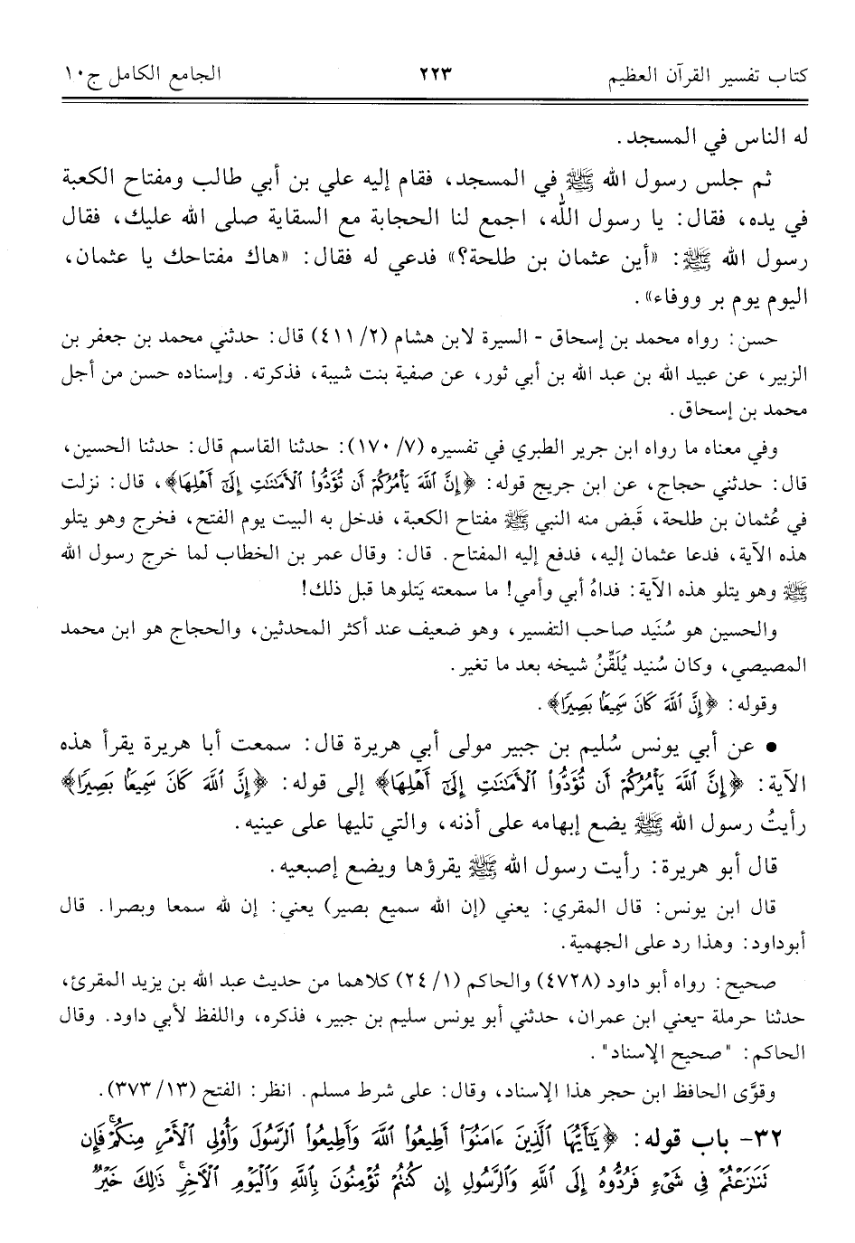 وفي معناه ما رواه ابن جرير الطبري في تفسيره (٧/ ١٧٠): حدّثنا القاسم قال: حدّثنا الحسين، قال: حدثني حجاج، عن ابن جريج قوله: {إِنَّ اللَّهَ يَأْمُرُكُمْ أَنْ تُؤَدُّوا الْأَمَانَاتِ إِلَى أَهْلِهَا}، قال: نزلت في عُثمان بن طلحة، قَبض منه النبي -صلى اللَّه عليه وسلم- مفتاح الكعبة، فدخل به البيت يوم الفتح، فخرج وهو يتلو هذه الآية، فدعا عثمان إليه، فدفع إليه المفتاح. قال: وقال عمر بن الخطاب لما خرج رسول اللَّه -صلى اللَّه عليه وسلم- وهو يتلو هذه الآية: فداهُ أبي وأمي! ما سمعته يَتلوها قبل ذلك!