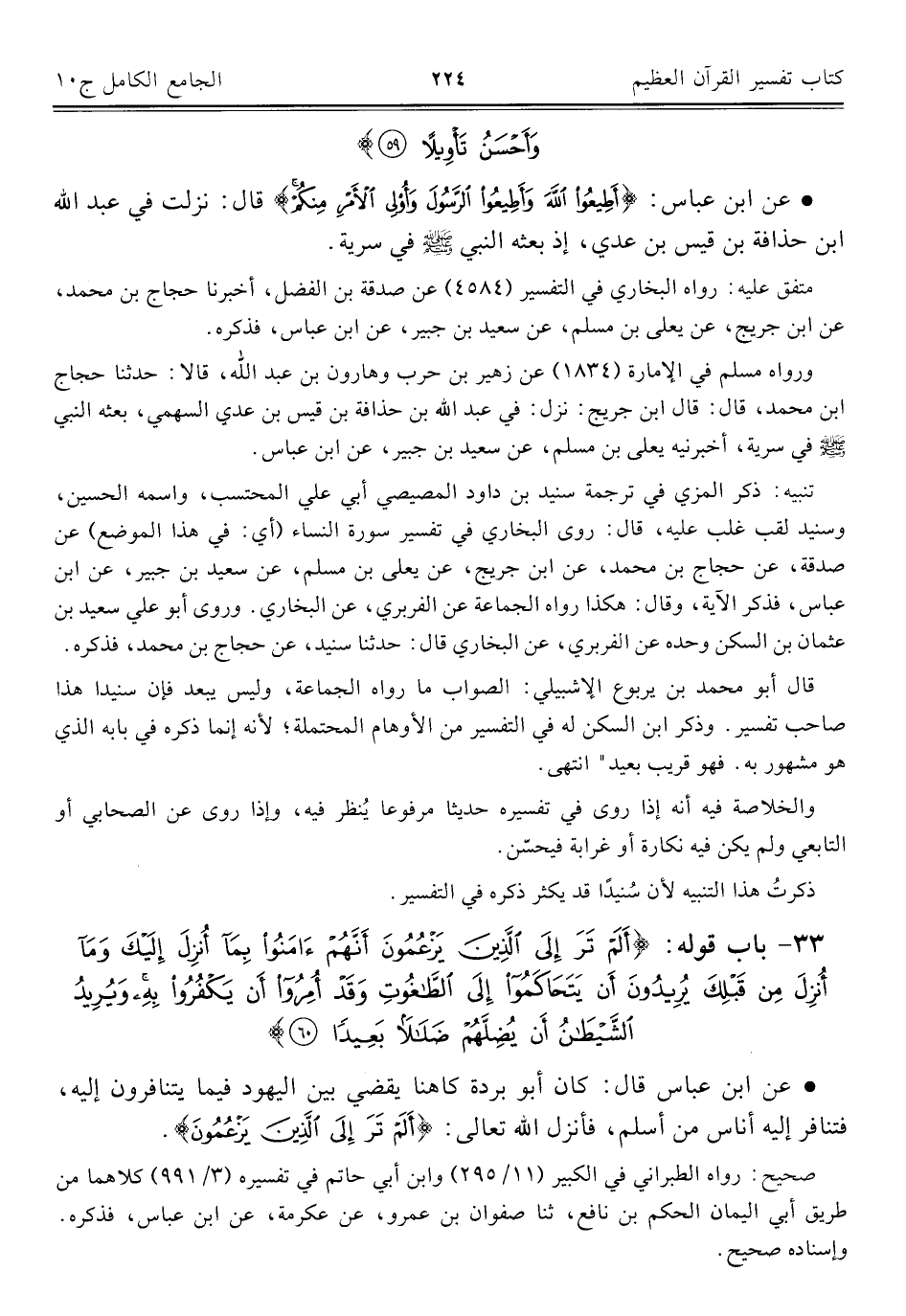 ورواه مسلم في الإمارة (١٨٣٤) عن زهير بن حرب وهارون بن عبد اللَّه، قالا: حدّثنا حجاج ابن محمد، قال: قال ابن جريج: نزل: في عبد اللَّه بن حذافة بن قيس بن عدي السهمي، بعثه النبي -صلى اللَّه عليه وسلم- في سرية، أخبرنيه يعلى بن مسلم، عن سعيد بن جبير، عن ابن عباس.