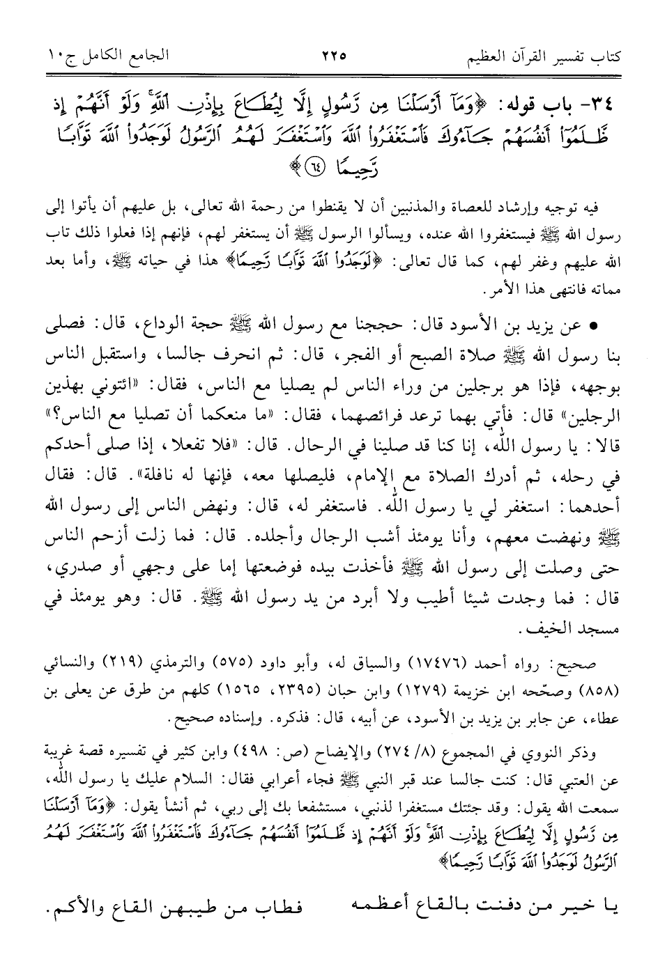 وذكر النووي في المجموع (٨/ ٢٧٤) والإيضاح (ص: ٤٩٨) وابن كثير في تفسيره قصة غريبة عن العتبي قال: كنت جالسا عند قبر النبي -صلى اللَّه عليه وسلم- فجاء أعرابي فقال: السلام عليك يا رسول اللَّه، سمعت اللَّه يقول: وقد جئتك مستغفرا لذنبي، مستشفعا بك إلى ربي، ثم أنشأ يقول: {وَمَا أَرْسَلْنَا مِنْ رَسُولٍ إِلَّا لِيُطَاعَ بِإِذْنِ اللَّهِ وَلَوْ أَنَّهُمْ إِذْ ظَلَمُوا أَنْفُسَهُمْ جَاءُوكَ فَاسْتَغْفَرُوا اللَّهَ وَاسْتَغْفَرَ لَهُمُ الرَّسُولُ لَوَجَدُوا اللَّهَ تَوَّابًا رَحِيمًا}.