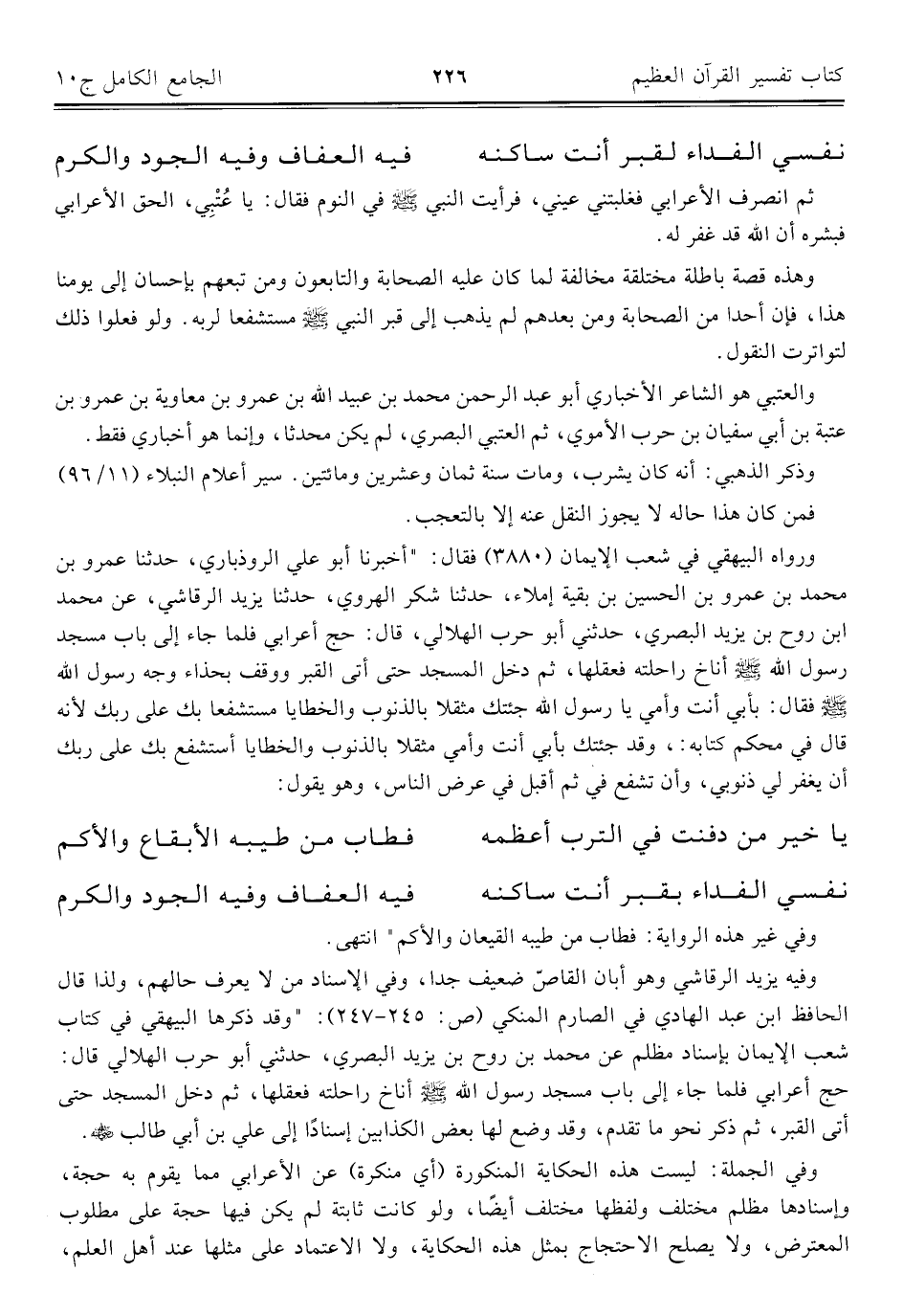 ورواه البيهقي في شعب الإيمان (٣٨٨٠) فقال: "أخبرنا أبو علي الروذباري، حدّثنا عمرو بن محمد بن عمرو بن الحسين بن بقية إملاء، حدّثنا شكر الهروي، حدّثنا يزيد الرقاشي، عن محمد ابن روح بن يزيد البصري، حدثني أبو حرب الهلالي، قال: حج أعرابي فلما جاء إلى باب مسجد رسول اللَّه -صلى اللَّه عليه وسلم- أناخ راحلته فعقلها، ثم دخل المسجد حتى أتى القبر ووقف بحذاء وجه رسول اللَّه -صلى اللَّه عليه وسلم- فقال: بأبي أنت وأمي يا رسول اللَّه جئتك مثقلا بالذنوب والخطايا مستشفعا بك على ربك لأنه قال في محكم كتابه: ، وقد جئتك بأبي أنت وأمي مثقلا بالذنوب والخطايا أستشفع بك على ربك أن يغفر لي ذنوبي، وأن تشفع في ثم أقبل في عرض الناس، وهو يقول: