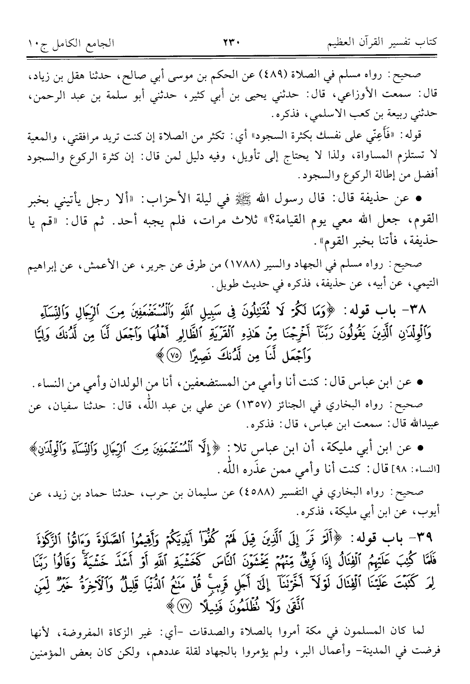 ٣٨ - باب قوله: {وَمَا لَكُمْ لَا تُقَاتِلُونَ فِي سَبِيلِ اللَّهِ وَالْمُسْتَضْعَفِينَ مِنَ الرِّجَالِ وَالنِّسَاءِ وَالْوِلْدَانِ الَّذِينَ يَقُولُونَ رَبَّنَا أَخْرِجْنَا مِنْ هَذِهِ الْقَرْيَةِ الظَّالِمِ أَهْلُهَا وَاجْعَلْ لَنَا مِنْ لَدُنْكَ وَلِيًّا وَاجْعَلْ لَنَا مِنْ لَدُنْكَ نَصِيرًا (٧٥)}