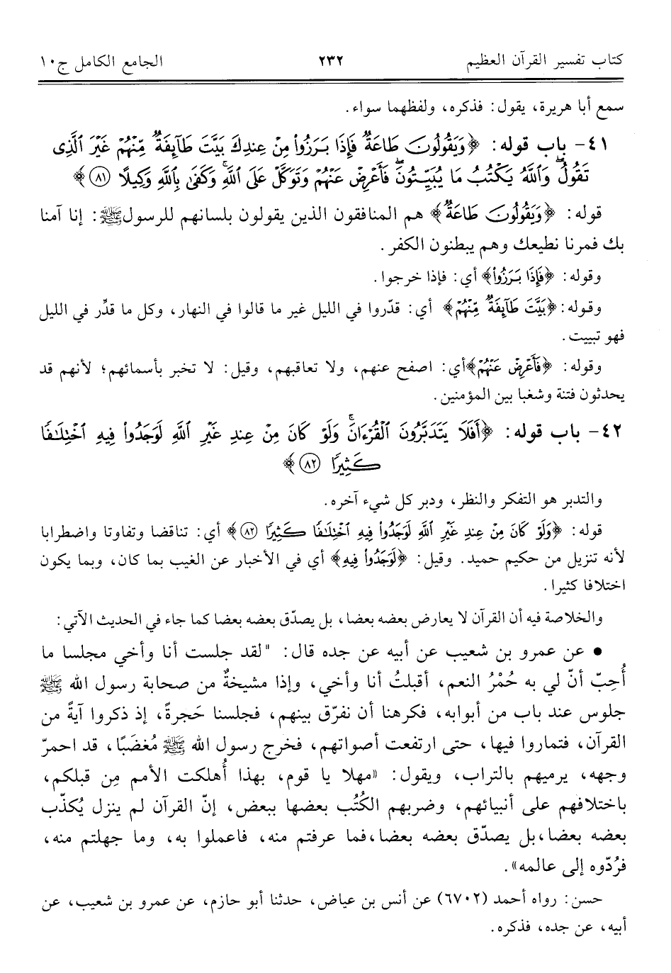 • عن عمرو بن شعيب عن أبيه عن جده قال: "لقد جلست أنا وأخي مجلسا ما أُحِبّ أنّ لي به حُمْرُ النعم، أقبلتُ أنا وأخي، وإذا مشيخةٌ من صحابة رسول اللَّه -صلى اللَّه عليه وسلم- جلوس عند باب من أبوابه، فكرهنا أن نفرّق بينهم، فجلسنا حَجرةً، إذ ذكروا آيةً من القرآن، فتماروا فيها، حتى ارتفعت أصواتهم، فخرج رسول اللَّه -صلى اللَّه عليه وسلم- مُغضَبًا، قد احمرّ وجهه، يرميهم بالتراب، ويقول: "مهلا يا قوم، بهذا أُهلكت الأمم مِن قبلكم، باختلافهم على أنبيائهم، وضربهم الكُتُب بعضها ببعض، إنّ القرآن لم ينزل يُكذّب بعضه بعضا، بل يصدّق بعضه بعضا، فما عرفتم منه، فاعملوا به، وما جهلتم منه، فرُدّوه إلى عالمه".