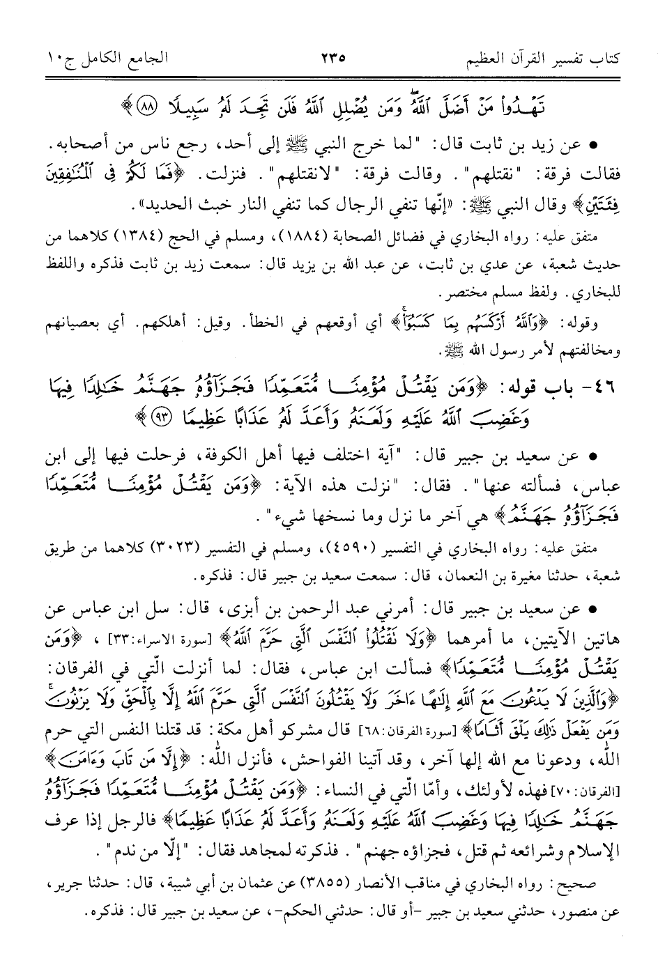• عن سعيد بن جبير قال: أمرني عبد الرحمن بن أبزى، قال: سل ابن عباس عن هاتين الآيتين، ما أمرهما {وَلَا تَقْتُلُوا النَّفْسَ الَّتِي حَرَّمَ اللَّهُ} [سورة الإسراء: ٣٣]، {وَمَنْ يَقْتُلْ مُؤْمِنًا مُتَعَمِّدًا} فسألت ابن عباس، فقال: لما أنزلت الّتي في الفرقان {وَالَّذِينَ لَا يَدْعُونَ مَعَ اللَّهِ إِلَهًا آخَرَ وَلَا يَقْتُلُونَ النَّفْسَ الَّتِي حَرَّمَ اللَّهُ إِلَّا بِالْحَقِّ وَلَا يَزْنُونَ وَمَنْ يَفْعَلْ ذَلِكَ يَلْقَ أَثَامًا} [سورة الفرقان: ٦٨] قال مشركو أهل مكة: قد قتلنا النفس التي حرم اللَّه، ودعونا مع اللَّه إلها آخر، وقد آتينا الفواحش، فأنزل اللَّه: {إِلَّا مَنْ تَابَ وَآمَنَ} [الفرقان: ٧٠] فهذه لأولئك، وأما الّتي في النساء: {وَمَنْ يَقْتُلْ مُؤْمِنًا مُتَعَمِّدًا فَجَزَاؤُهُ جَهَنَّمُ خَالِدًا فِيهَا وَغَضِبَ اللَّهُ عَلَيْهِ وَلَعَنَهُ وَأَعَدَّ لَهُ عَذَابًا عَظِيمًا} فالرجل إذا عرف الإسلام وشرائعه ثم قتل، فجزاؤه جهنم". فذكرته لمجاهد فقال: "إلّا من ندم".