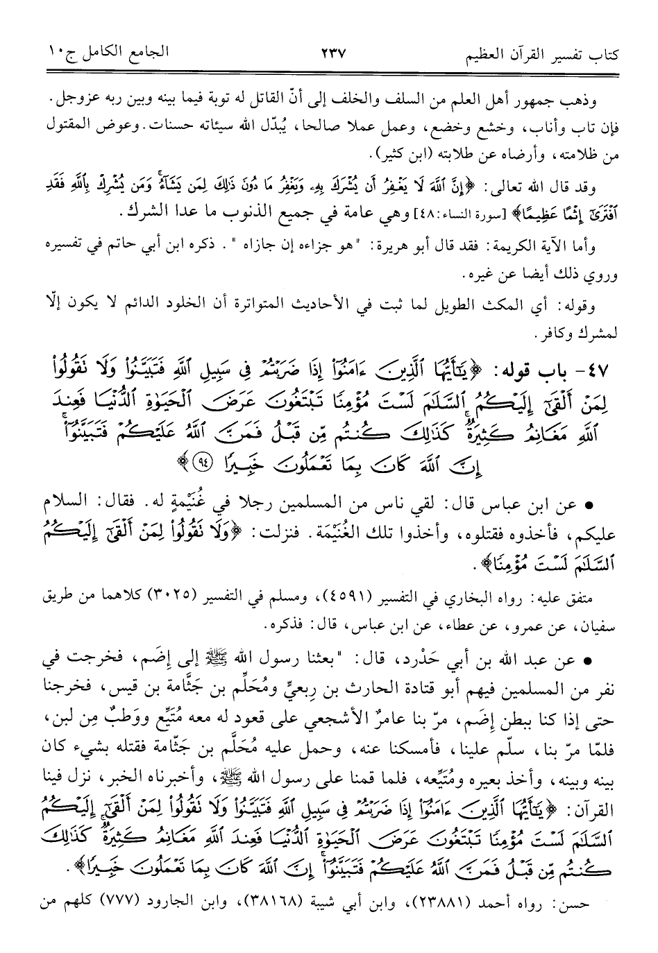 • عن ابن عباس قال: لقي ناس من المسلمين رجلا في غُنيمةٍ له. فقال: السلام عليكم، فأخذوه فقتلوه، وأخذوا تلك الغُنيمَة. فنزلت: {وَلَا تَقُولُوا لِمَنْ أَلْقَى إِلَيْكُمُ السَّلَامَ لَسْتَ مُؤْمِنًا}.