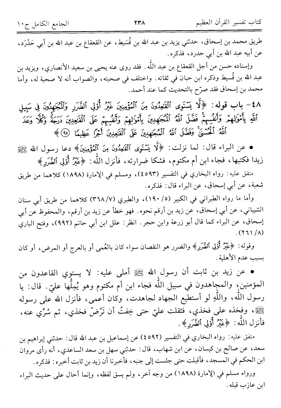 • عن البراء قال: لما نزلت: {لَا يَسْتَوِي الْقَاعِدُونَ مِنَ الْمُؤْمِنِينَ} دعا رسول اللَّه -صلى اللَّه عليه وسلم- زيدا فكتبها، فجاء ابن أم مكتوم، فشكا ضرارته، فأنزل اللَّه: {غَيْرُ أُولِي الضَّرَرِ}.