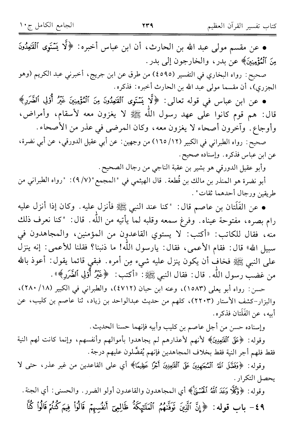 • عن مقسم مولى عبد اللَّه بن الحارث، أن ابن عباس أخبره: {لَا يَسْتَوِي الْقَاعِدُونَ مِنَ الْمُؤْمِنِينَ} عن بدر، والخارجون إلى بدر.