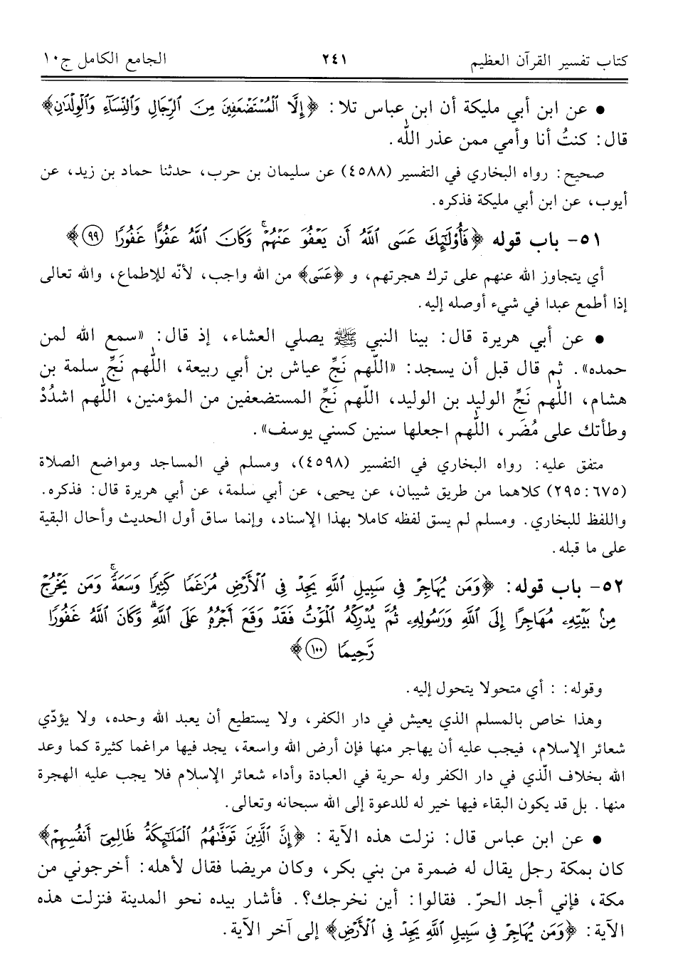 ٥٢ - باب قوله: {وَمَنْ يُهَاجِرْ فِي سَبِيلِ اللَّهِ يَجِدْ فِي الْأَرْضِ مُرَاغَمًا كَثِيرًا وَسَعَةً وَمَنْ يَخْرُجْ مِنْ بَيْتِهِ مُهَاجِرًا إِلَى اللَّهِ وَرَسُولِهِ ثُمَّ يُدْرِكْهُ الْمَوْتُ فَقَدْ وَقَعَ أَجْرُهُ عَلَى اللَّهِ وَكَانَ اللَّهُ غَفُورًا رَحِيمًا (١٠٠)}