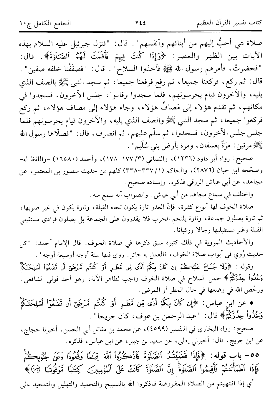 صلاة هي أحبُّ إليهم من أبنائهم وأنفسهم". قال: "فنزل جبرئيل عليه السلام بهذه الآيات بين الظهر والعصر: {وَإِذَا كُنْتَ فِيهِمْ فَأَقَمْتَ لَهُمُ الصَّلَاة}. قال: "فحضرتْ، فأمرهم رسول اللَّه -صلى اللَّه عليه وسلم- فأخذوا السلاح". قال: "فصفَفْنا خلفه صفين". قال: ثم ركع، فركعنا جميعا، ثم رفع فرفعنا جميعا، ثم سجد النبي -صلى اللَّه عليه وسلم- بالصف الذي يليه، والآخرون قيام يحرسونهم، فلما سجدوا وقاموا، جلس الآخرون، فسجدوا في مكانهم، ثم تقدم هؤلاء إلى مَصافِّ هؤلاء، وجاء هؤلاء إلى مصاف هؤلاء، ثم ركع فركعوا جميعا، ثم سجد النبي -صلى اللَّه عليه وسلم- والصف الذي يليه، والآخرون قيام يحرسونهم فلما جلس جلس الآخرون، فسجدوا، ثم سلّم عليهم، ثم انصرف، قال: "فصلّاها رسول اللَّه -صلى اللَّه عليه وسلم- مرتين: مرةً بعسفان، ومرة بأرض بني سُلَيم".