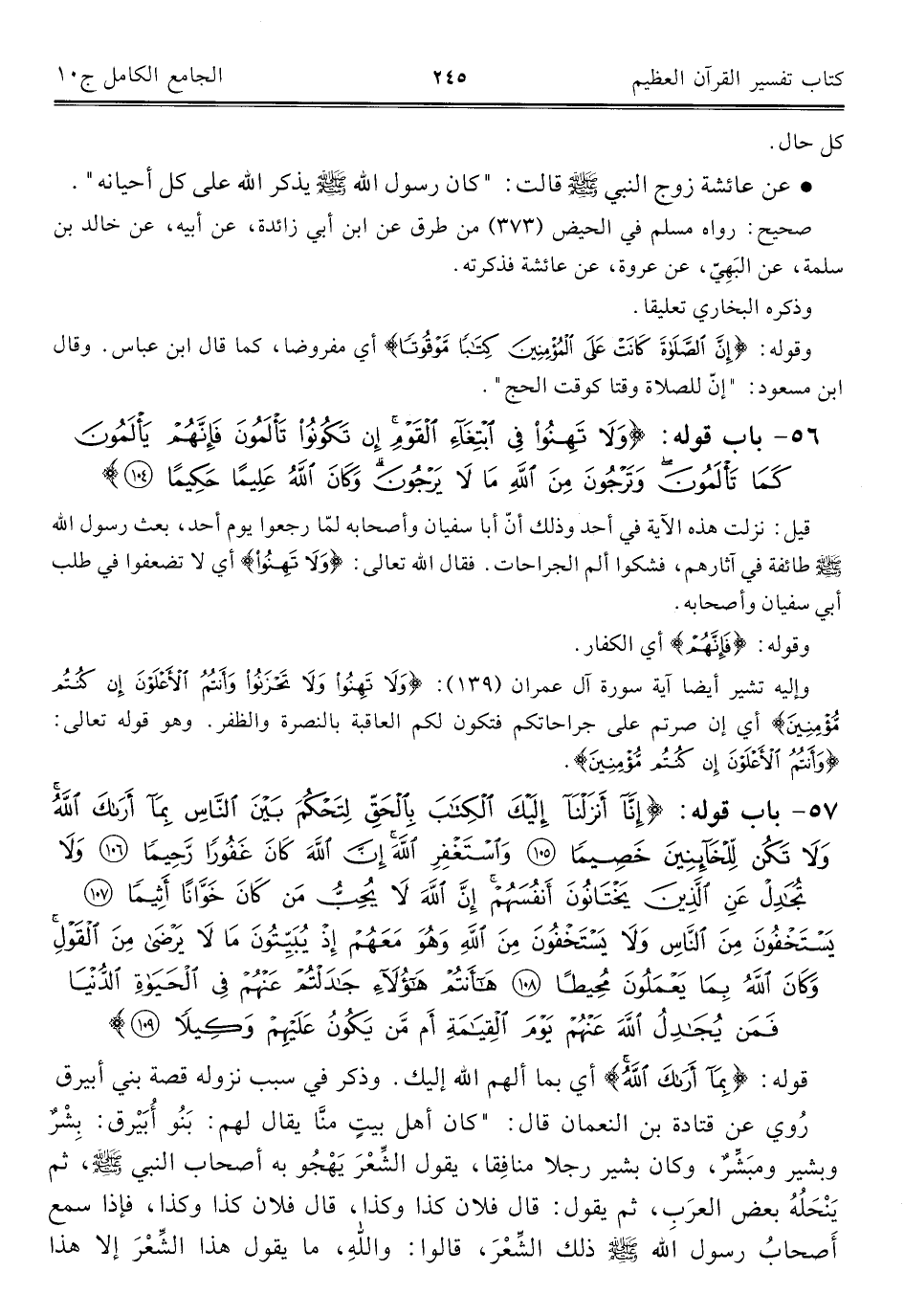 ٥٦ - باب قوله: {وَلَا تَهِنُوا فِي ابْتِغَاءِ الْقَوْمِ إِنْ تَكُونُوا تَأْلَمُونَ فَإِنَّهُمْ يَأْلَمُونَ كَمَا تَأْلَمُونَ وَتَرْجُونَ مِنَ اللَّهِ مَا لَا يَرْجُونَ وَكَانَ اللَّهُ عَلِيمًا حَكِيمًا (١٠٤)}